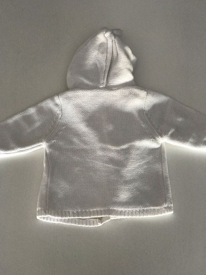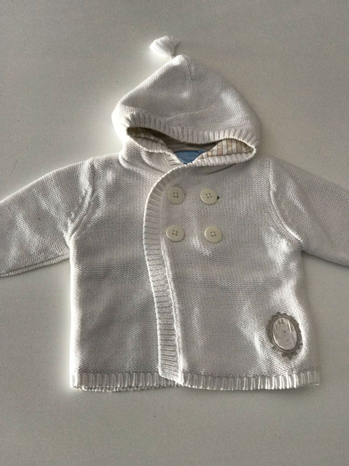 Manteau blanc tricoté Winnie, 100% coton et doublure 100% coton, avec capuche à pompon. Taille 1-3 mois