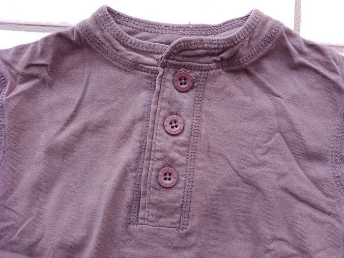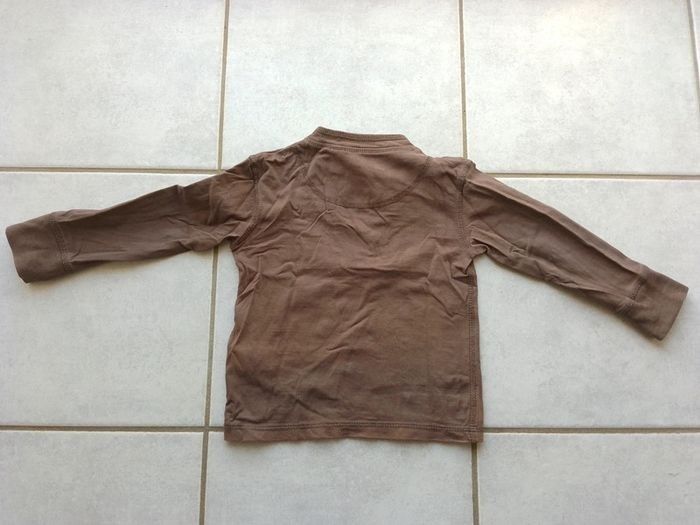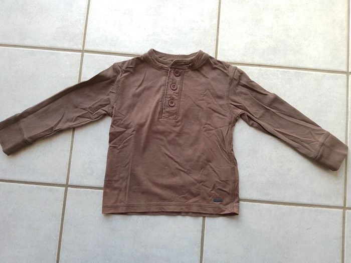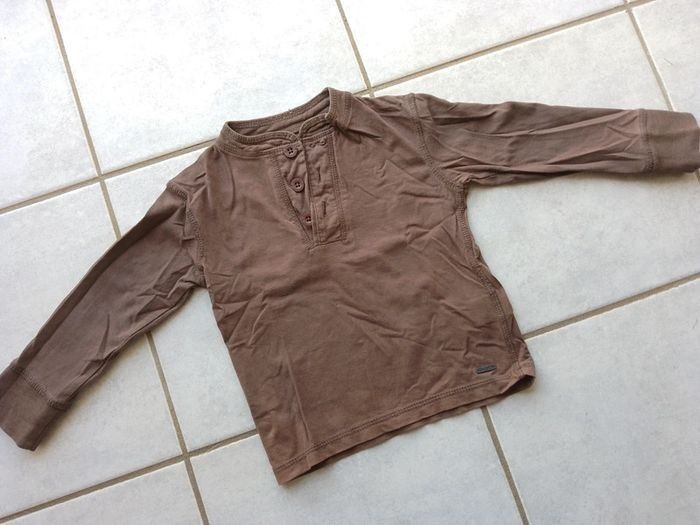 T-shirt manches longues Okaïdi, marron, encolure fermant avec trois boutons.