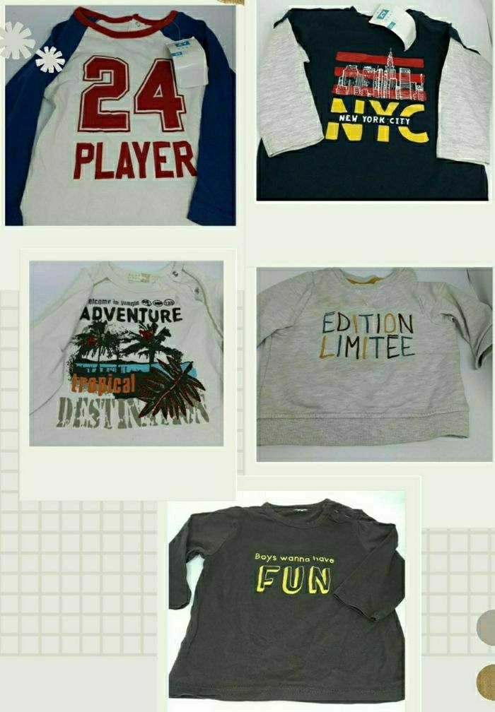 Vendre 4 Tshirt marches long et 1 pull pour bébé garçon 6 mois. 2 Tshirt êtat neuf avec etiqutte.