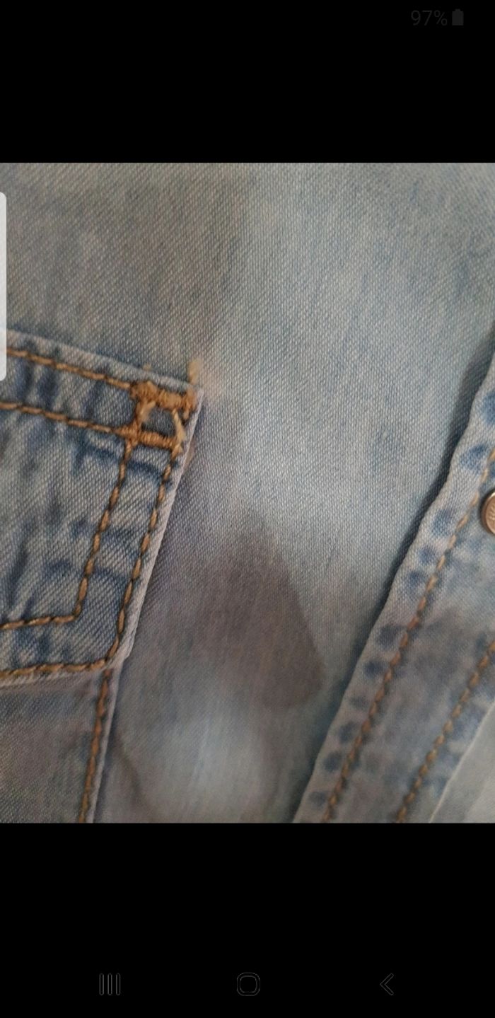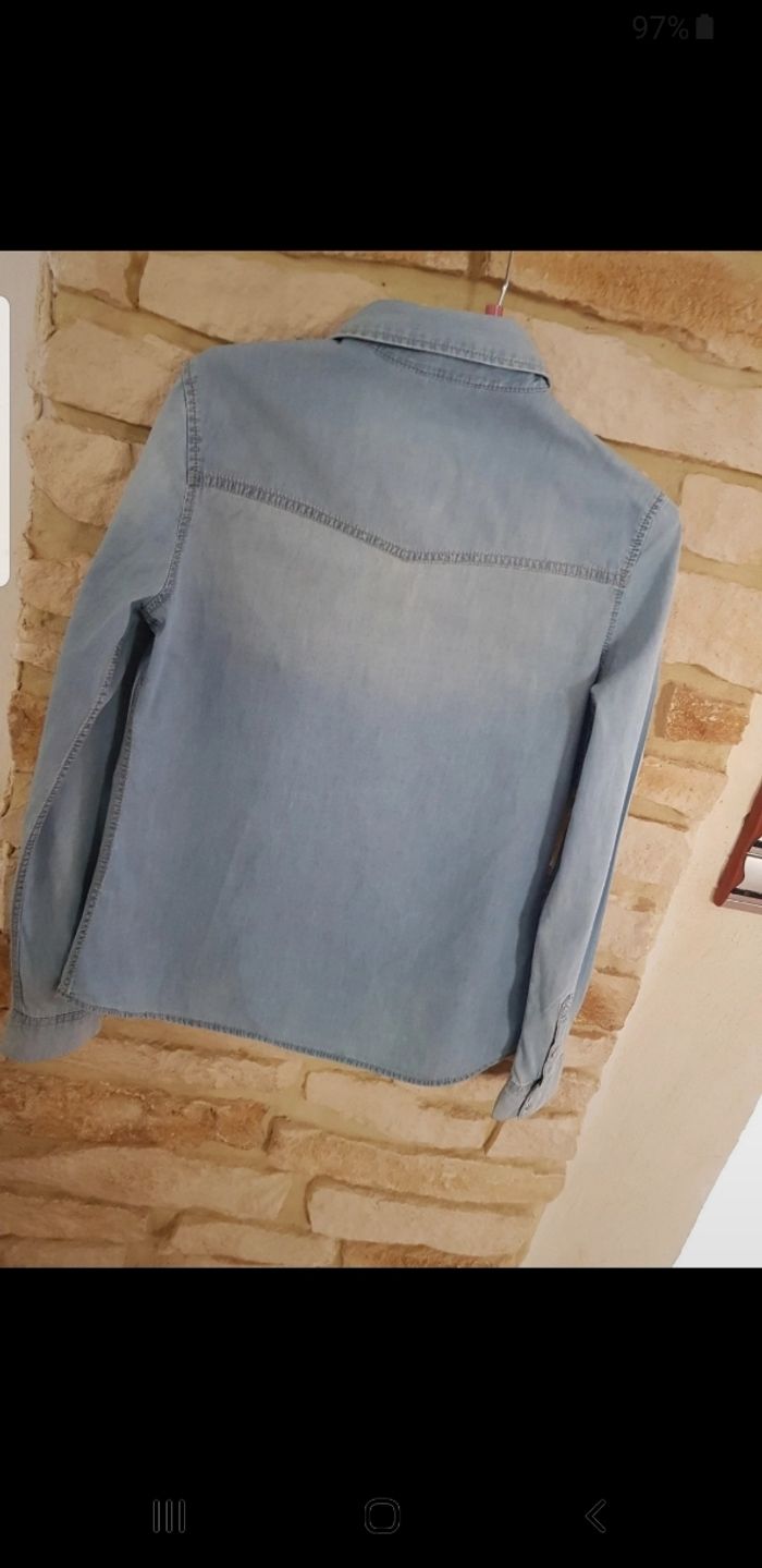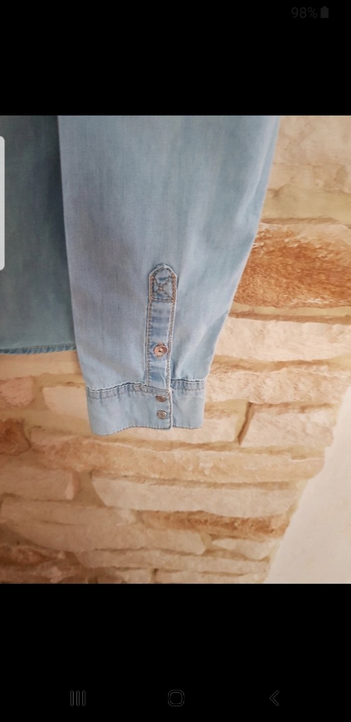 Chemise manches longues. Fermeture par pressions à l avant. Deux poches, avec un petit défaut sur le dessus pour l une d entre elles ( voir photo )