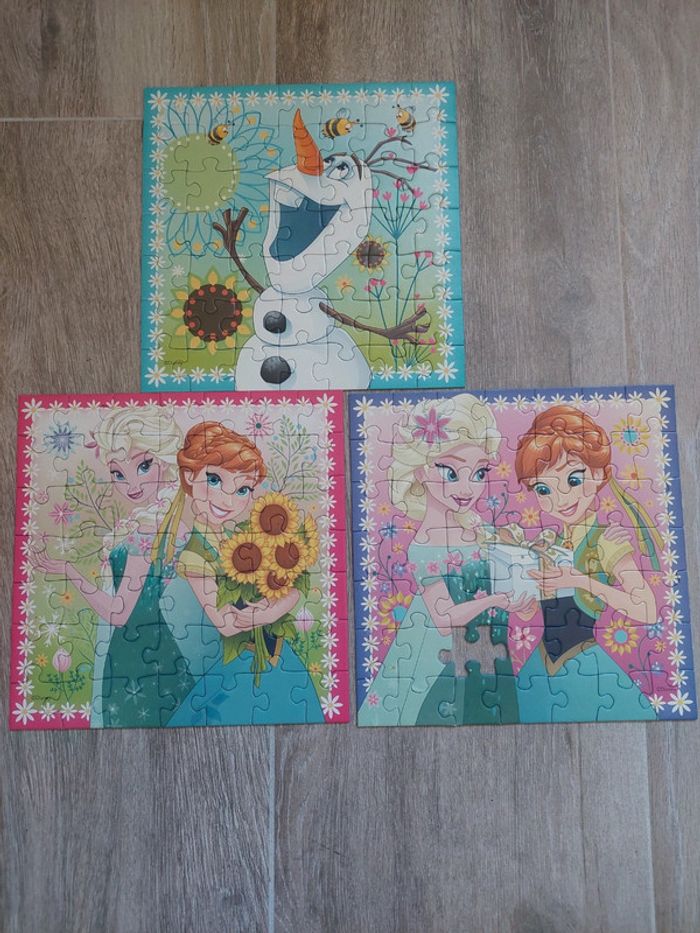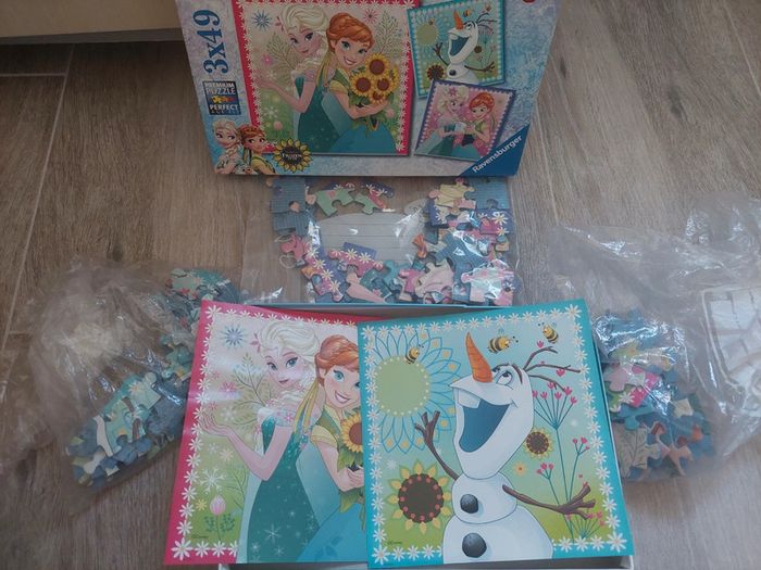 Boîte comprenant 3 puzzles de 49 pièces de la Reine des Neiges. Il manque 1 pièce sur 1 puzzle et il manque 1 modèle. Ravensburger A partir de 5 ans. #jeuaurelilou34 #5ansaurelilou34 #6ansaurelilou34 #7ansaurelilou34 #8ansaurelilou34