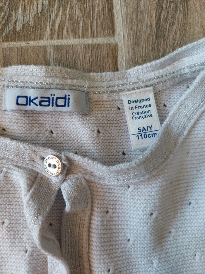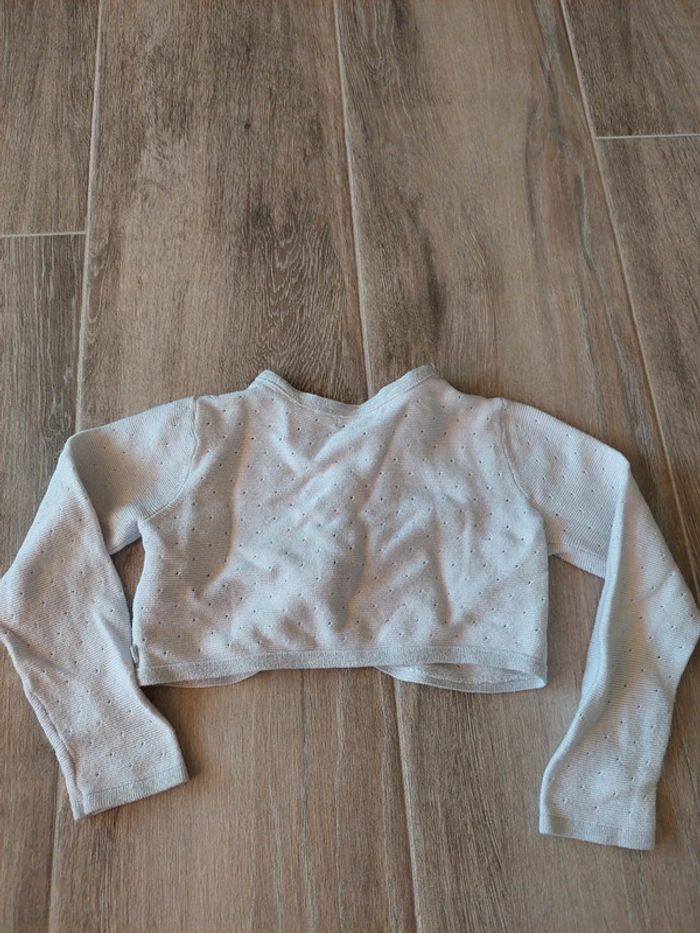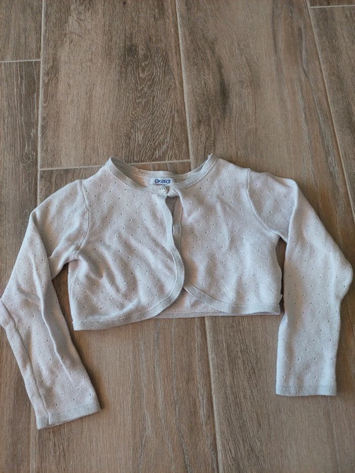 Gilet court / boléro blanc avec bordures irisées et 1 bouton. Okaïdi, 5 ans #5ansaurelilou34