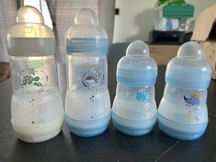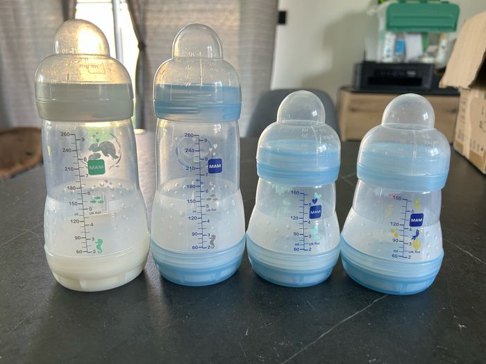 À vendre lot de biberon mam anti colique, deux biberons 160ml et deux biberons 260ml