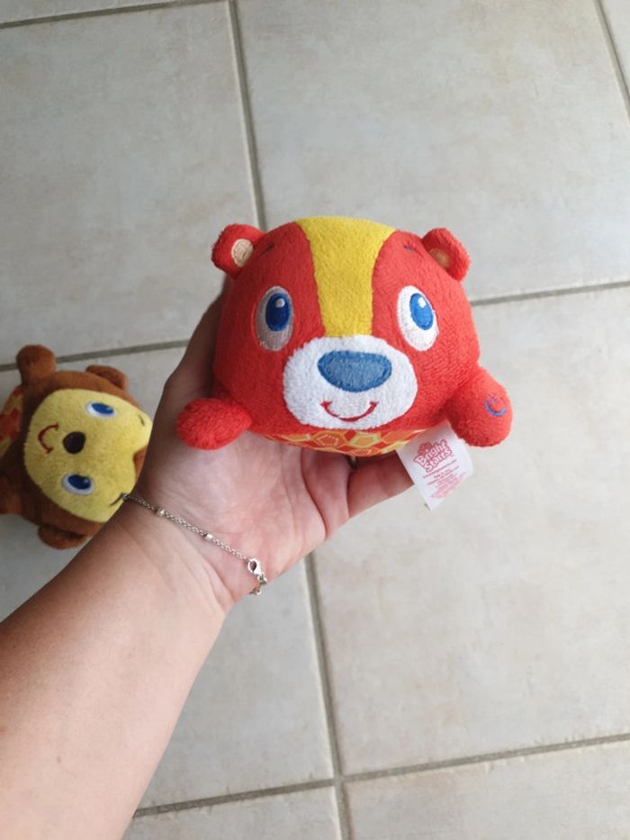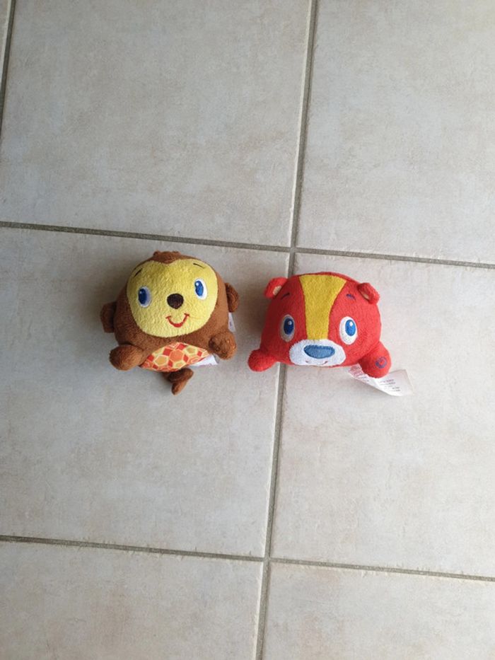Lot de 2 peluches à se lancer Elles ne font plus de musique Il y a des billes à l'intérieur ainsi que la boîte du mécanisme, peuvent peut être fonctionner en changeant les piles mais il faut découdre Très bon état car jamais servi