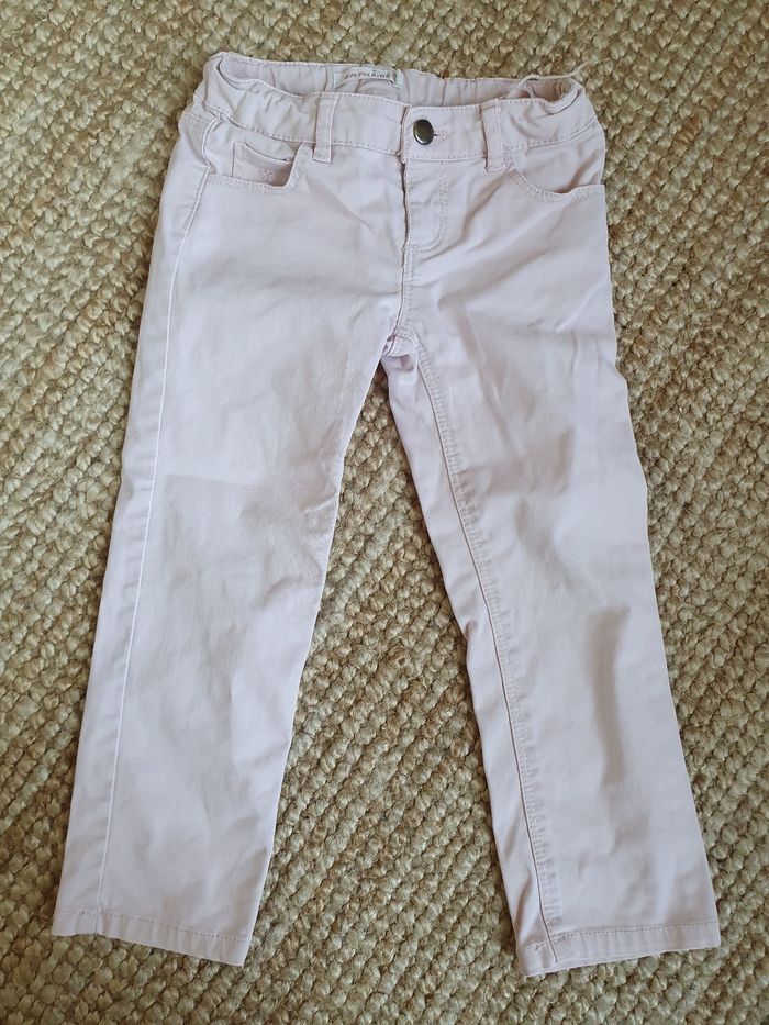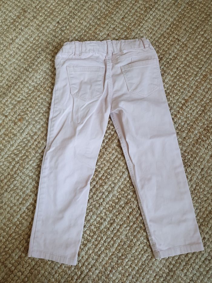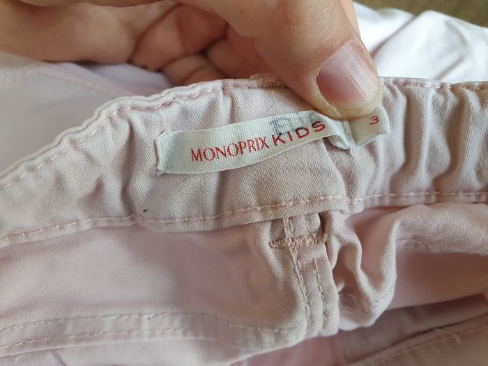 Pantalon rose pâle, taille 3 ans, monoprix. État moyen : taches/traces sur les genoux (voir photo).