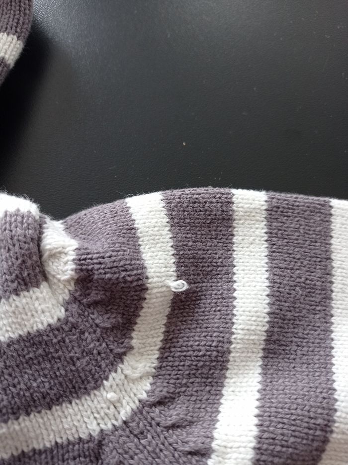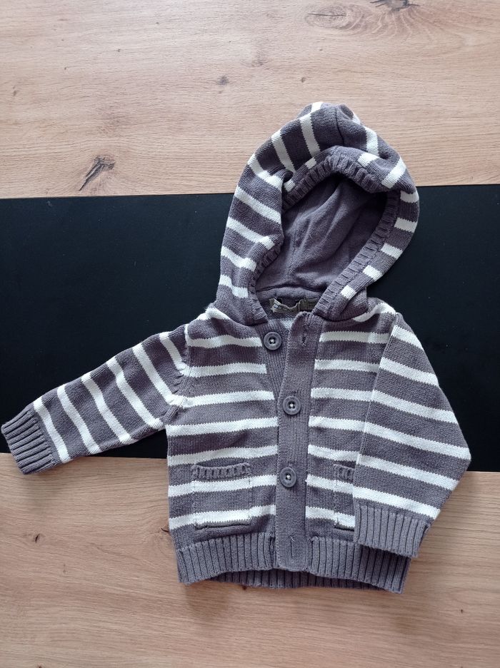 Gilet a manches longues et à capuche marron rayé blanc. ⚠️Il y a un accroc sur une manche (c.f photo)⚠️ Marque : Tape à l'oeil Taille : 6 mois/67 cm