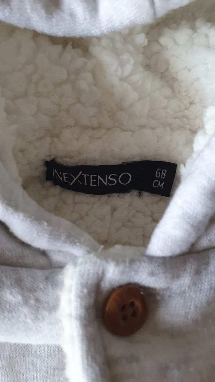 Veste fourrée avec capuche, bébé garçon , Inextenso, manches longues, gris clair, fourrure synthétique, taille 68cm, 6 / 9 mois, très bon état