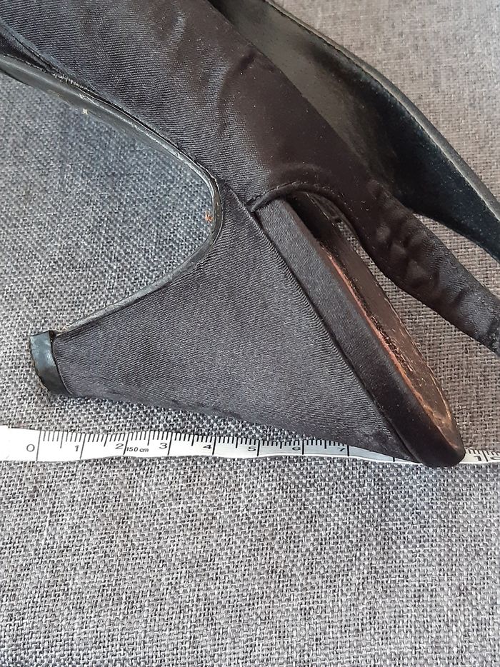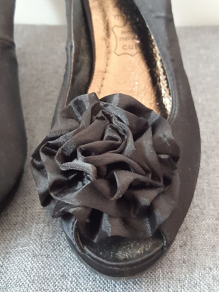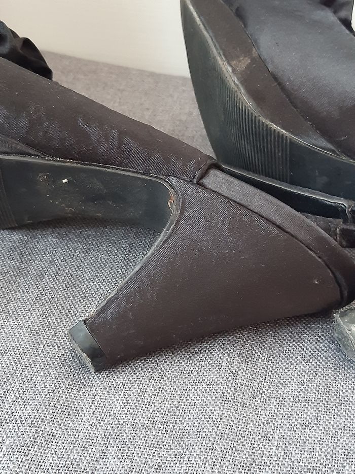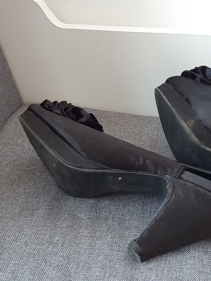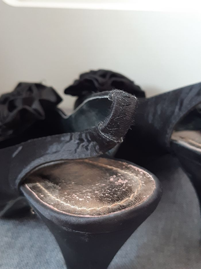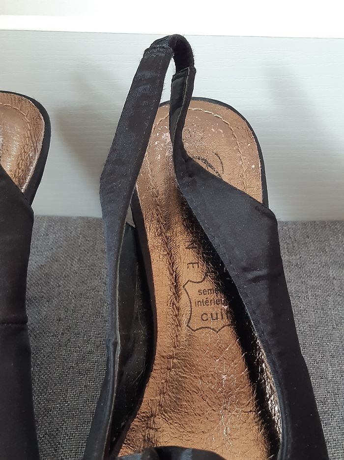 Chaussures Noir Satin Élastique au niveau du talon D'autres photos possible sur demande Merci de privilégier les envois par Mondial Relay