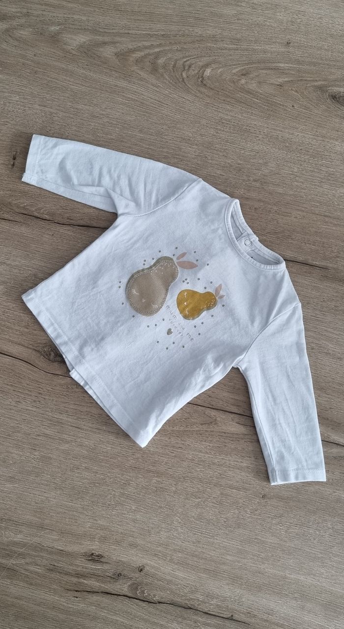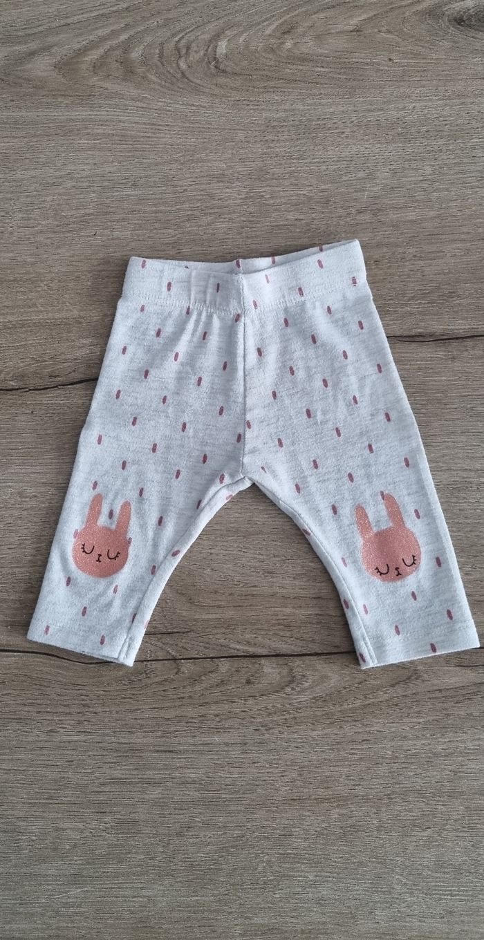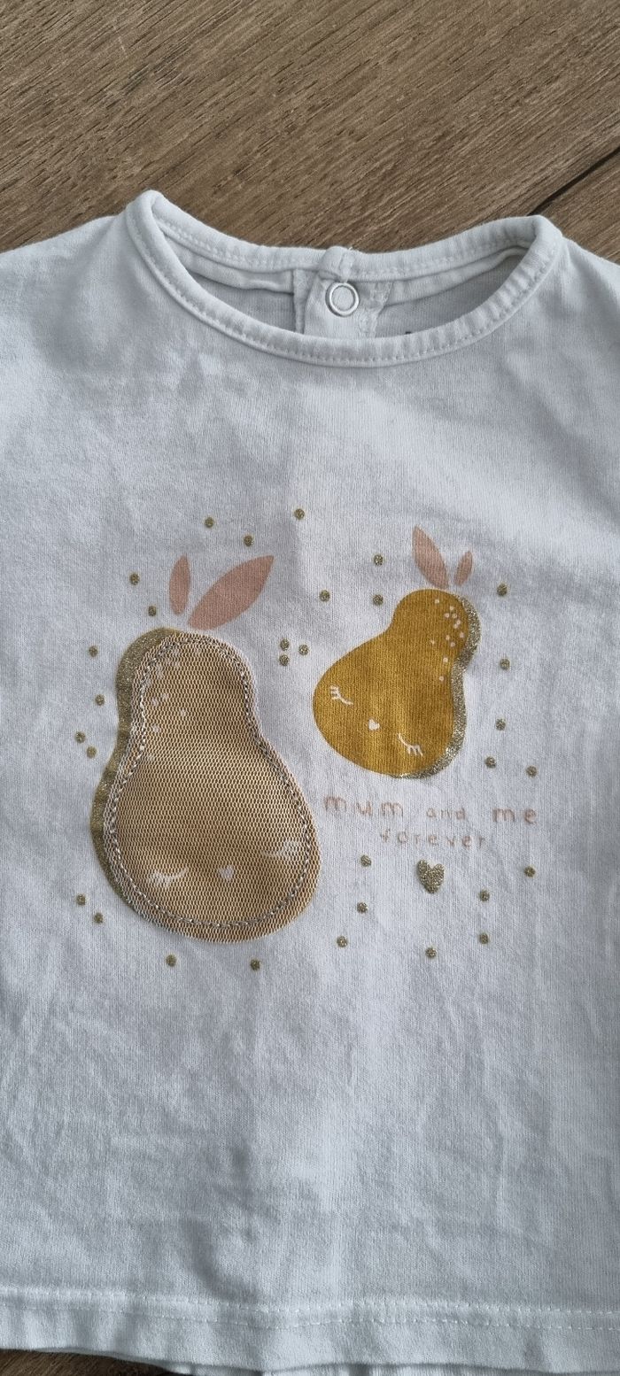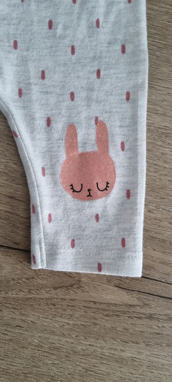 Ensemble incluant un t-shirt à manches longues avec motifs poires 🍐, fermeture par boutons pression le long du dos, et un legging avec tête de lapin rose pailleté Kiabi taille 3 mois Excellent état