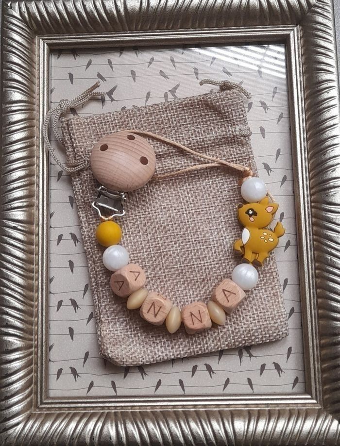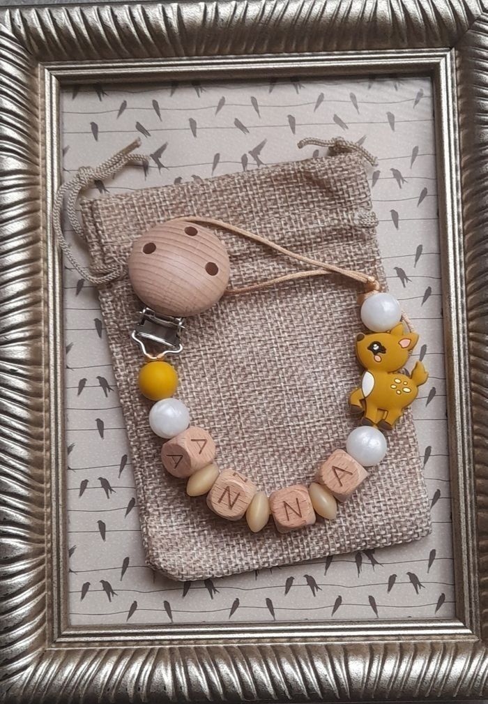 Attache tétine personnalisé avec le prénom de votre choix tout le matériel utilisé est aux normes européennes . Perles en silicone ou en bois ou un mélange selon les modèles . En respectant les normes de sécurité pour bébé ,n'hésitez pas à regarder dans mon dressing il y a plus de 150 modèles et aussi à m'envoyer un message pour plus d'informations. 🔴 une petite remarque pour les prénoms qui sont très long il y aura forcément moins de perles sur les cotés ou quelques changements sur le modèle c'est pour respecter les normes de sécurité pour bébé il y a une langueur à respecter merci pour votre compréhension. 🔴Aussi l'utilisation de l'attache doit être sous surveillance et toujours vérifier si l attache tétine est intacte et les nœuds sont toujours bien fermés pour la sécurité de nos boutchous. Je vous remercie pour la lecture de ces consignes