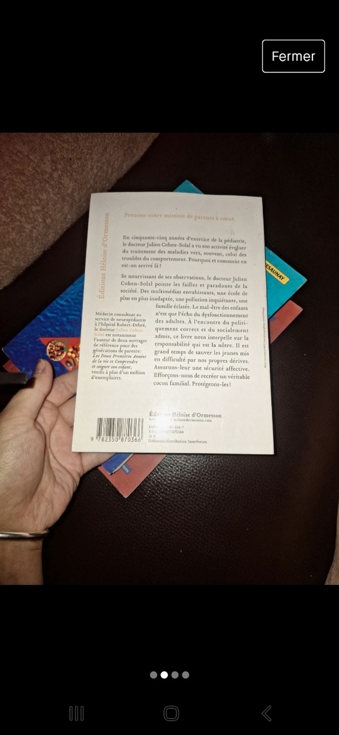 Auteur(s) : julien cohen-solal Editeur : Héloïse D'ormesson Résumé : En cinquante-cinq années d'exercice de la pédiatrie,le docteur Julien Cohen-Solal a vu son activité évoluer du traitement des maladies vers, souvent, celui des troubles du comportement. Pourquoi et comment en est-on arrivé là ? Se nourrissant de ses observations, le docteur Julien Cohen-Solal pointe les failles et paradoxes de la société. Des multimédias envahissants, une école de plus en plus inadaptée, une pollution inquiétante, une famille éclatée. Le mal-être des enfants n'est que l'écho du dysfonctionnement des adultes. A l'encontre du politiquement correct et du socialement admis, ce livre nous interpelle sur la responsabilité qui est la nôtre. Il est grand temps de sauver les jeunes mis en difficulté par nos propres dérives. Assurons-leur une sécurité affective. Efforçons-nous de recréer un véritable cocon familial. Protégeons-les! Sommaire: ["Les symptômes du mal-être chez les enfants","Comment se fabrique un petit enfant ? Qui peut être responsable du malaise des enfants ? Les modes de garde","L'enfant et l'école","Et pourtant, les progrès de la médecine sont extraordinaires","La pollution pourrait devenir \" un crime contre l'humanité \"","La télévision est déjà presque \" un crime contre l'humanité \"","Les politiques"]