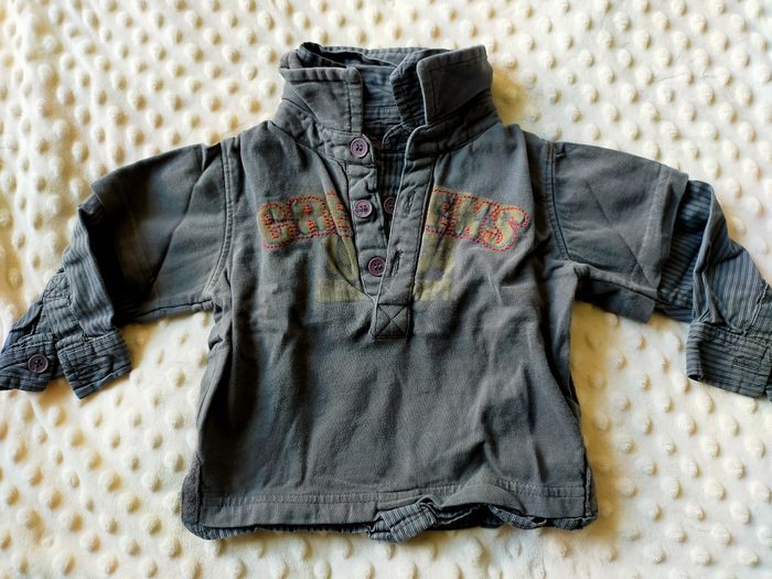 Vends tee-shirt à manches longues de couleur gris/kaki. État : très bon état Taille : 12 mois