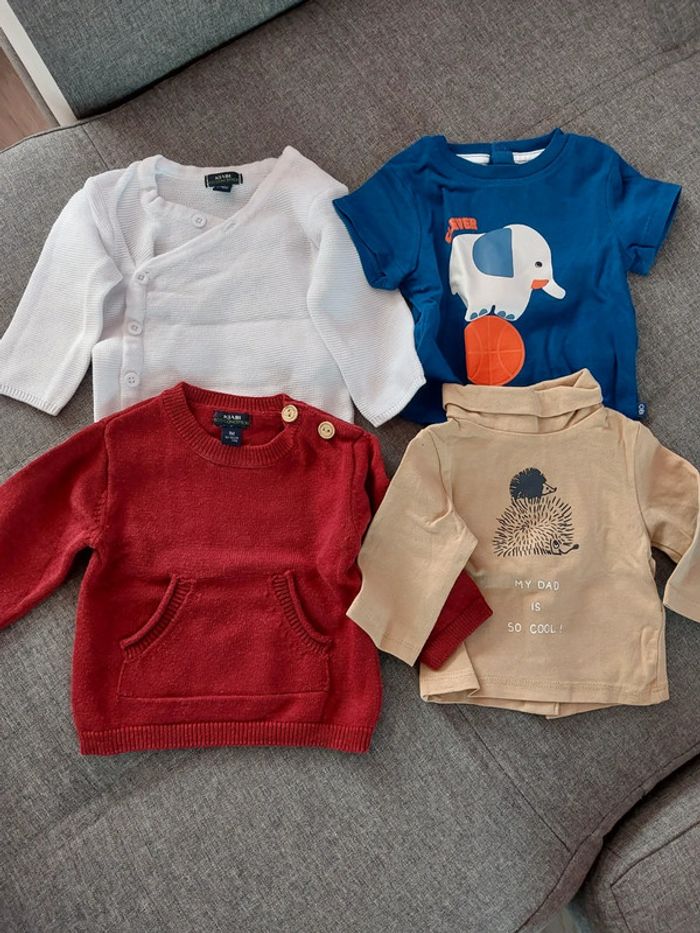 Lot de haut taille 1 mois Un pull un gilet un tee shirt et un maillot manche longue En trés bon état