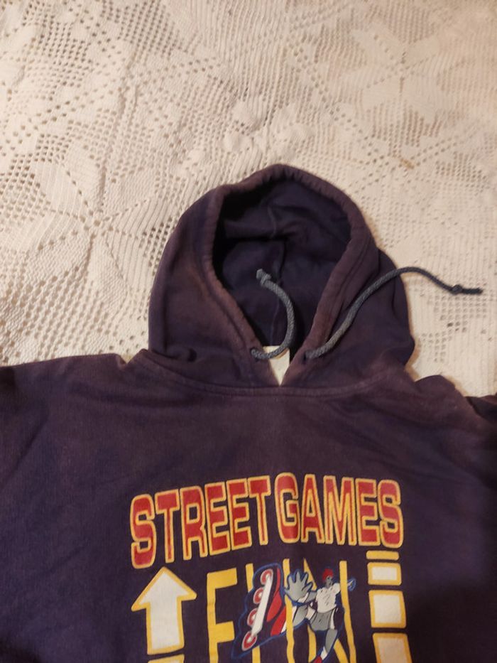 sweat marine 14 ans, capuche légèrement décolorée
