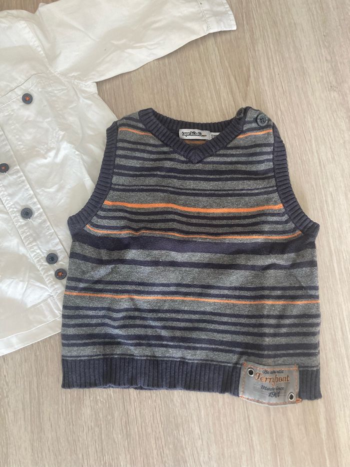 Ensemble composé d’une chemise blanche habillé et d’un pull fin sans manches assortis pour mettre au dessus. Très classe Excellent état 12 mois