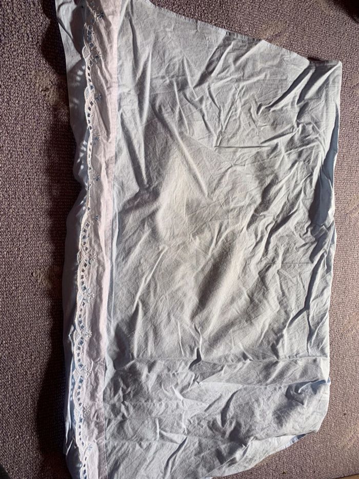 drap dessus berceau bleu ciel, broderie, avec taie oreiller, presque neuf
