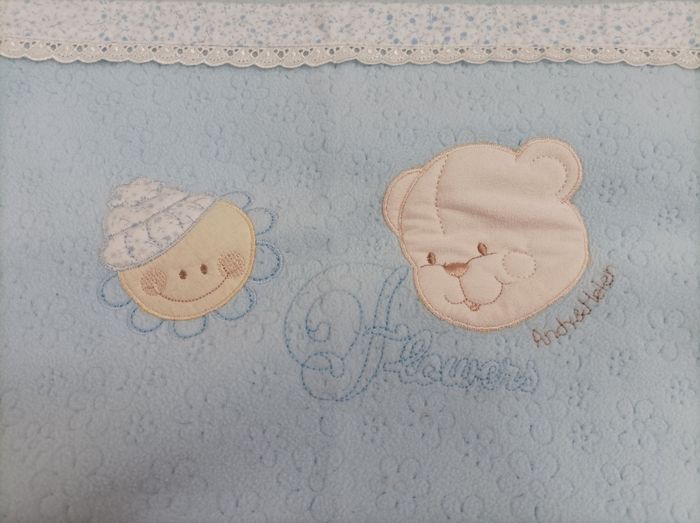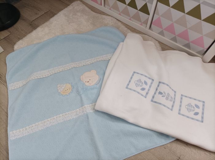 Vend lot de deux couvertures bébés. Un couleur bleu Flowers Andy & Helen Le deuxième blanc brodé fleurs bleu pas de marque écrite Jamais utilisé juste lavé
