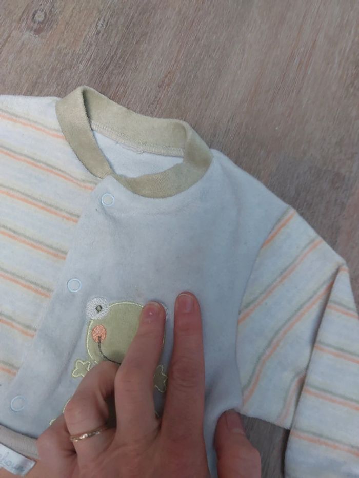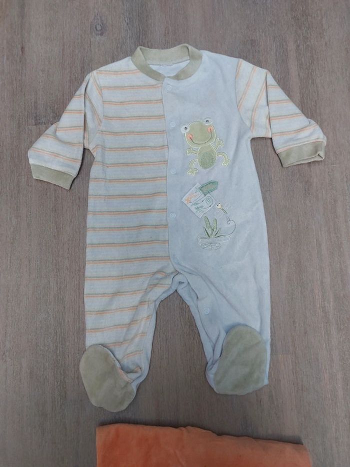 #jessicadebreu6moisgarçon Pyjama velours ouverture sur le devant 1 kitchoun 1 sans marque ( taches peuvisible voir photo) Grenouille et lion