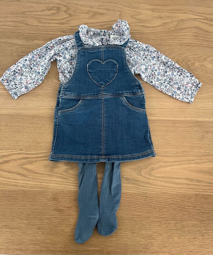 Ensemble comprenant une blouse manche longue motif fleur, une robe en jean à bretelle et des collants bleus.