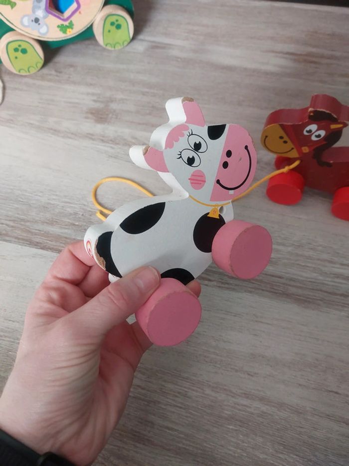 #jessicadebreujouetbebe #jessicadebreujouetbois Un cheval et une vache à tirer Nombreux eclats de peinture Manque la ficelle de la vache