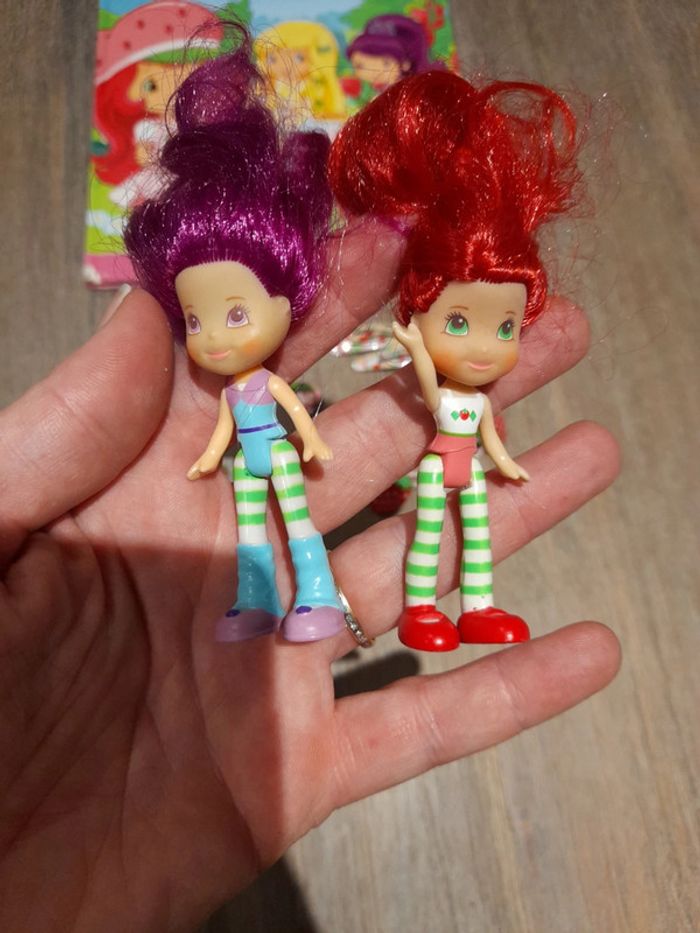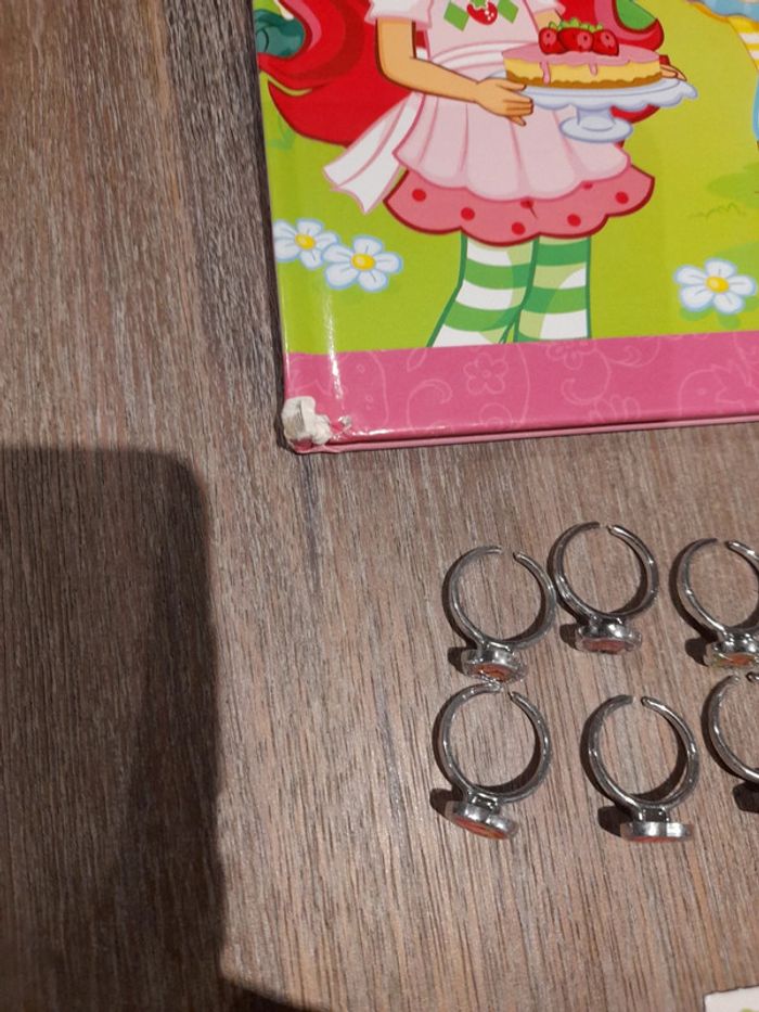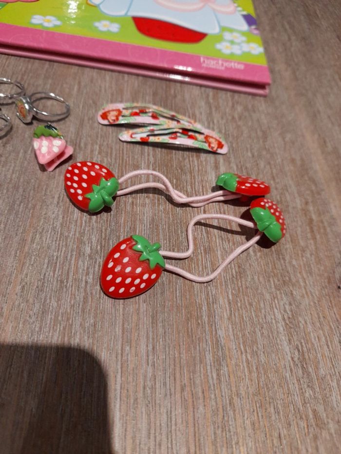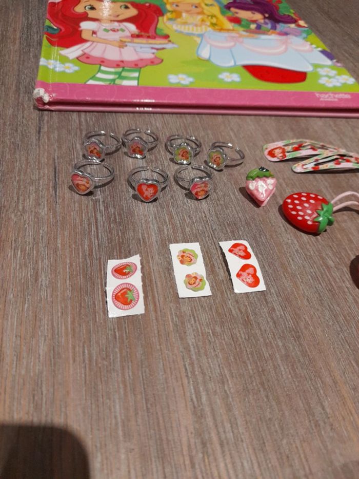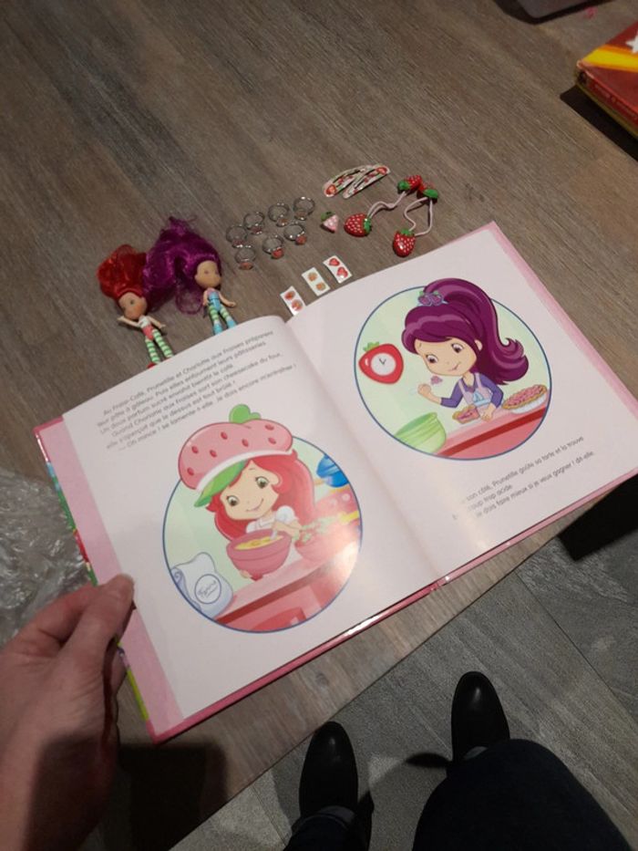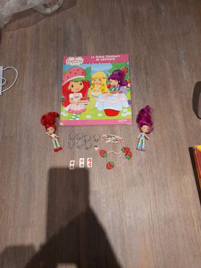 #jessicadebreujouetfille Lot charlotte aux fraises 🍓 2 minis poupées senteur 7 bagues et 3 boucles d'oreilles à coller 1 paire de pince en enfilé 1 mini pince et 2 elastiques fraises 🍓 1 livre un coin est abîmé