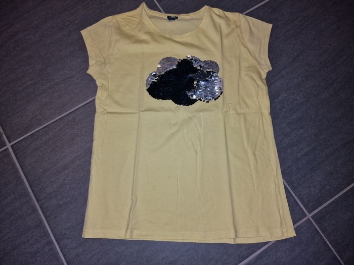 Bonjour 👋 Je vend ce : 👉 T-shirt " kiabi" 12 ans - jaune motif nuages ☁️ sequin réversible Maison 🏠 non fumeur et sans animaux