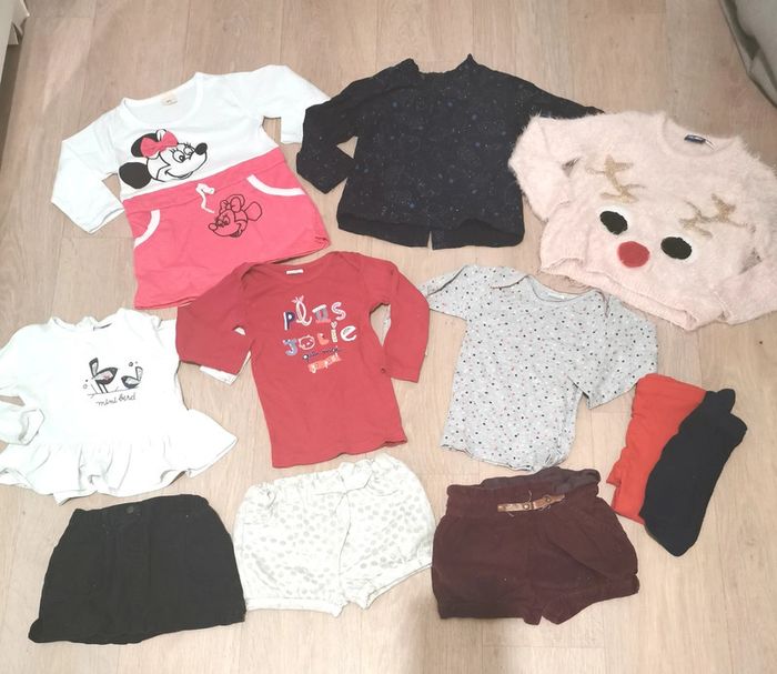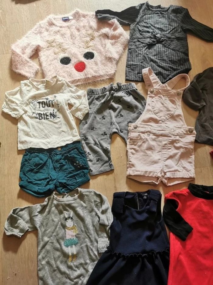 Lot 12 mois, plusieurs marques, composé de : *5 robes / robes pull * 3 ensembles (je donne le t-shirt "tout va bien" car petit trou *1 pull de Noël (12/24 mois) *1 bas de jogging sarouel * 4 blouses /t-shirts ML *1 salopette short * 2 shorts * 1 jupe * 2 leggings Le tout en bon état général