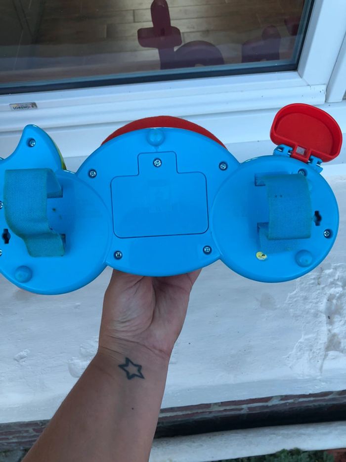 En très bon état. Ce volant interactif s'attache facilement à la poussette, au siège coque (siège auto) grâce aux sangles ajustables pour une position plus confortable. Bébé tourne le volant pour déclencher des phrases amusantes et des sons rigolos de moteur. Nombreux éléments à manipuler : une clef à tourner, un levier de vitesse, un bouton Klaxon, un rétroviseur avec un miroir… Bébé découvre les opposés et de nouveaux mots de vocabulaire. Un miroir en forme de rétroviseur pour se regarder. 2 en 1 : le volant se détache pour jouer au sol.