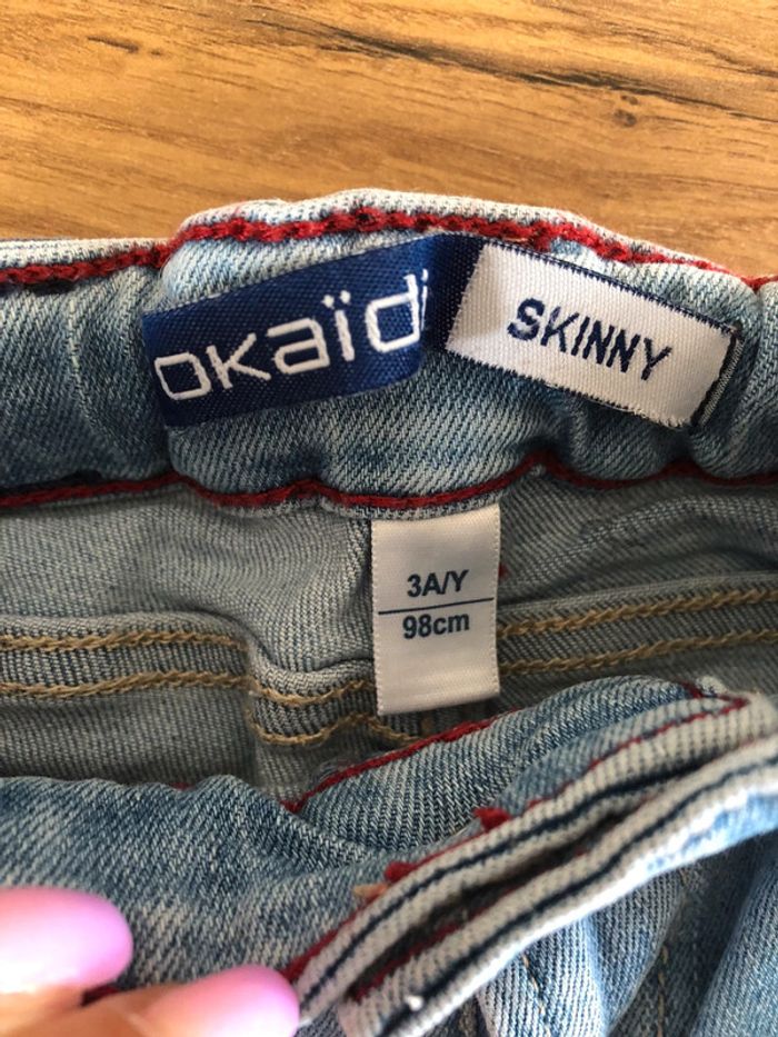 Jeans skinny Okaïdi Taille 3 ans en très bon état avec élastiques pour régler la taille.