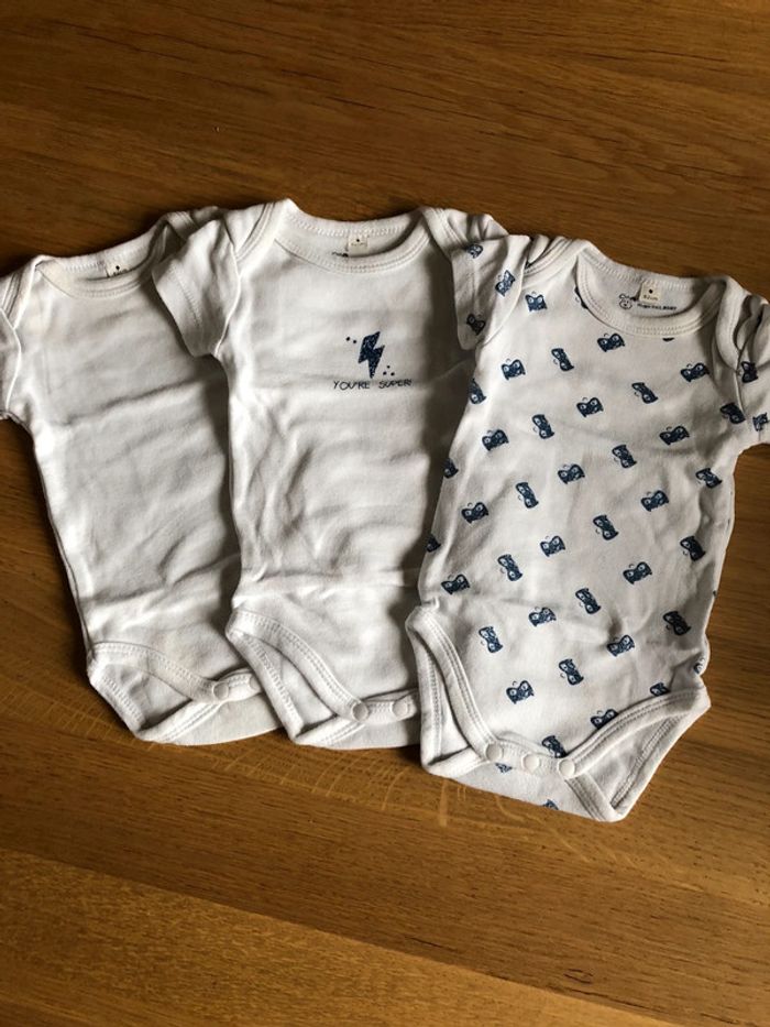 Lot de 3 bodies manches courtes Taille 3 mois légèrement tachés au niveau du cou pour le tout blanc.