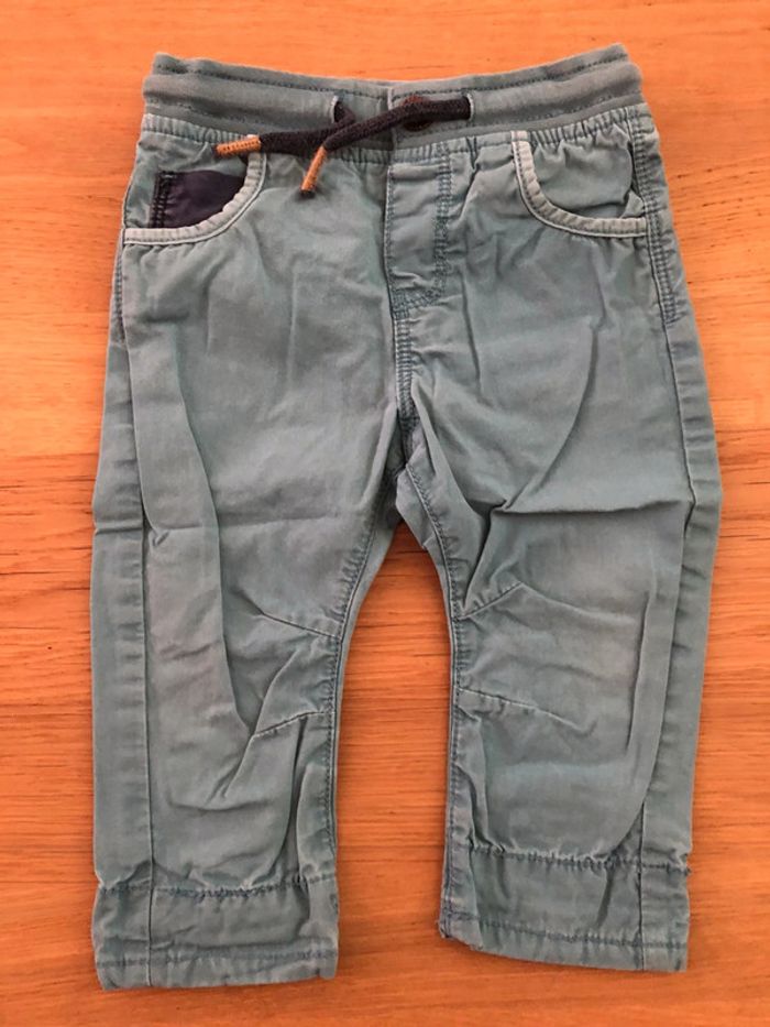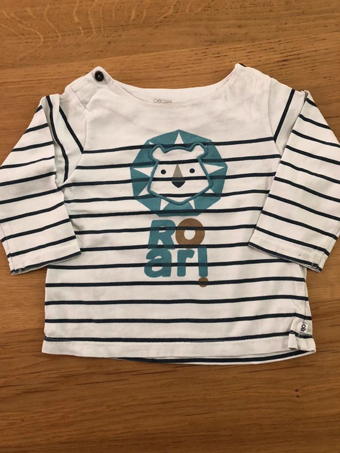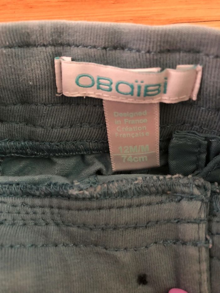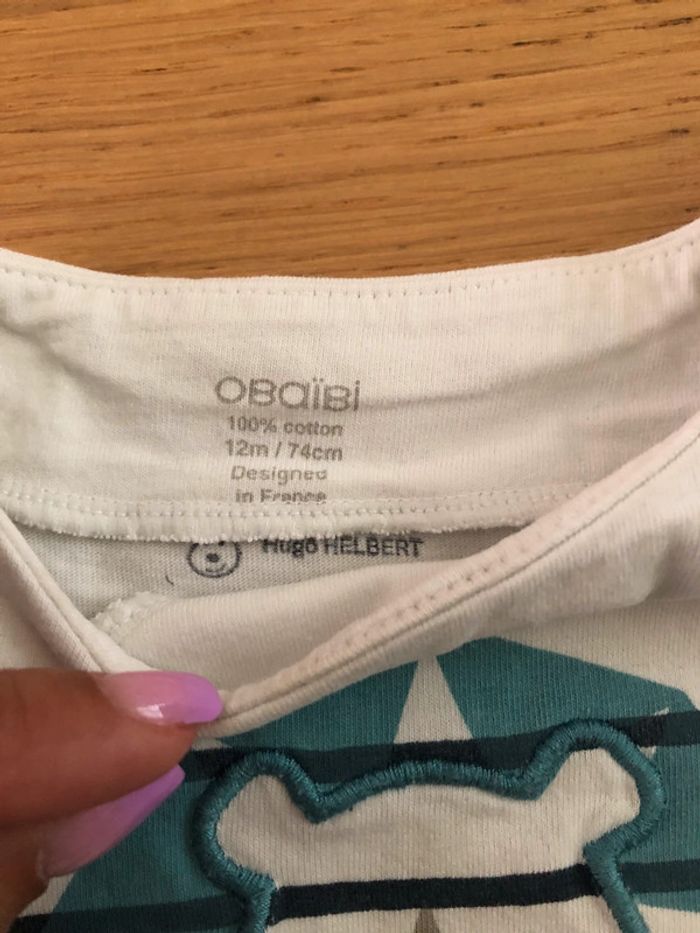 Ensemble Obaïbi Taille 12 mois en très bon état : - T-shirt manches longues avec boutons au niveau du cou pour faciliter le passage de tête. - pantalon avec cordon pour régler la taille.