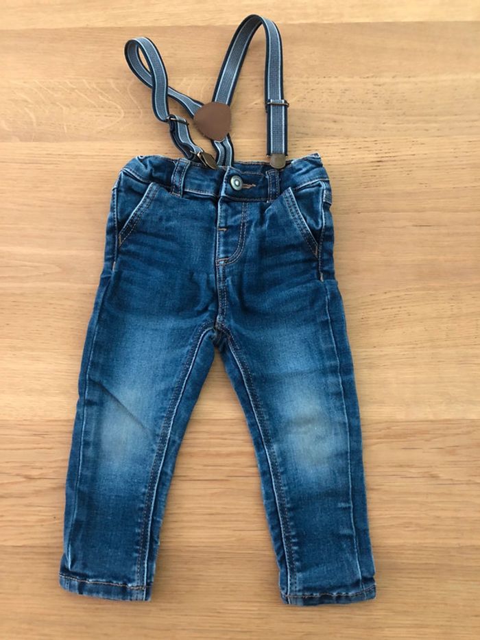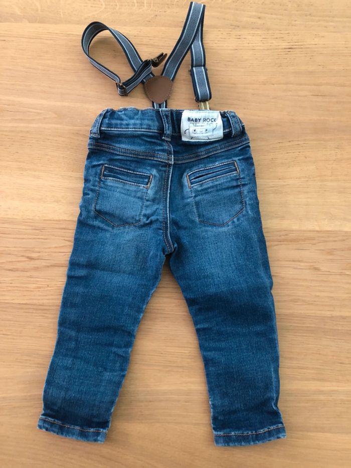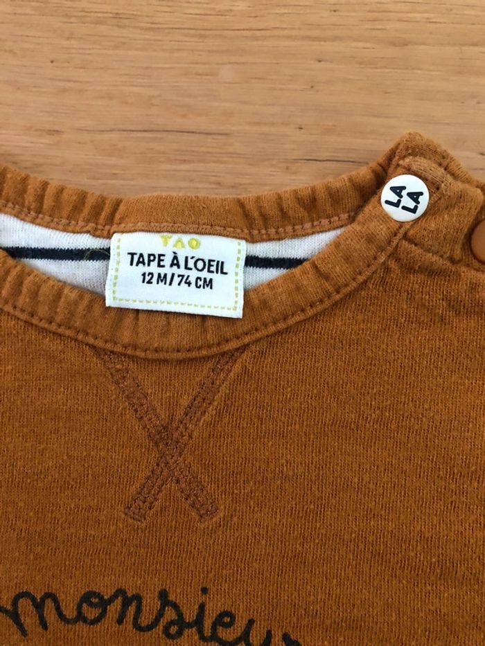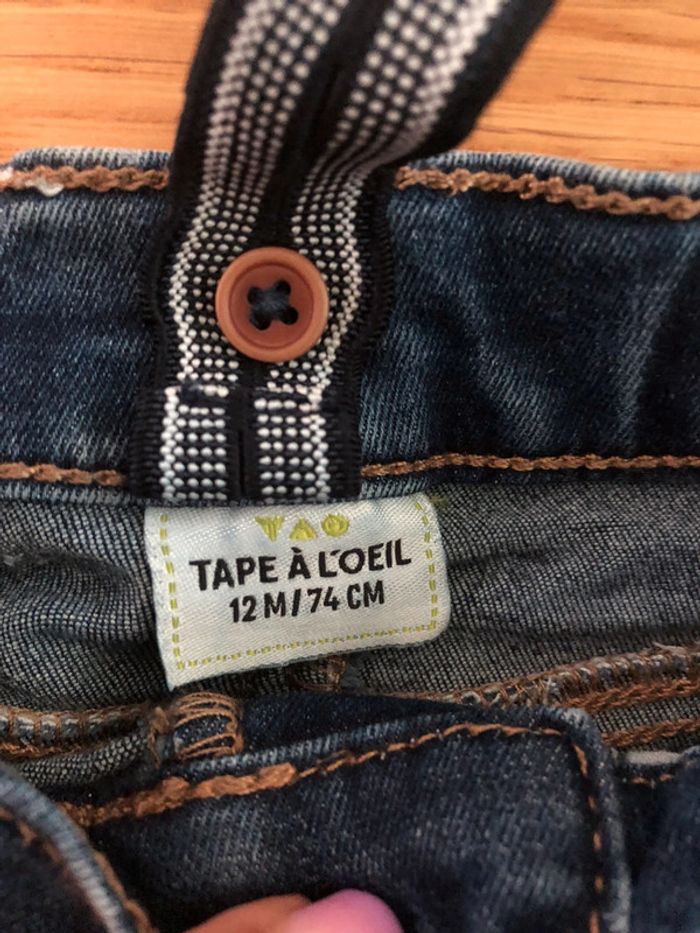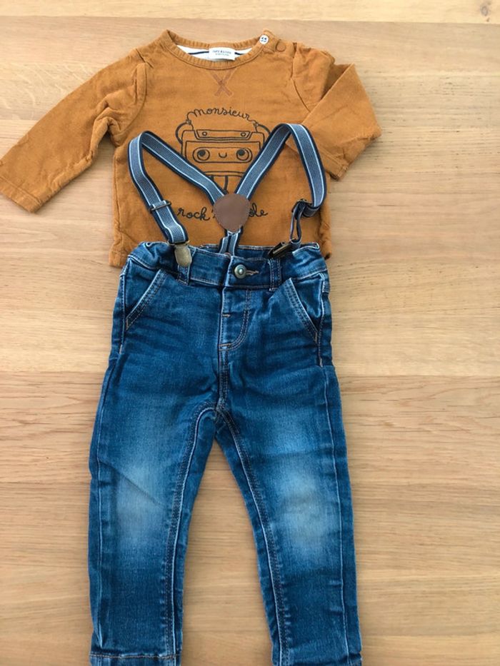 Ensemble Tape à l’œil Taille 12 mois en très bon état : - Tee-shirts manches longues avec pressions au niveau du cou pour faciliter le passage de la tête. - Jeans slim avec élastiques pour régler la taille + bretelles.