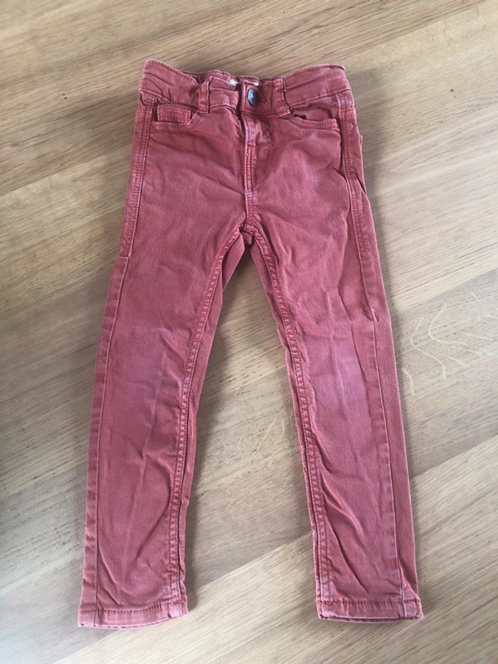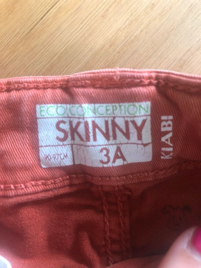 Pantalon Skinny couleur brique Kiabi Taille 3 ans en très bon état. Réglage élastique à la taille.