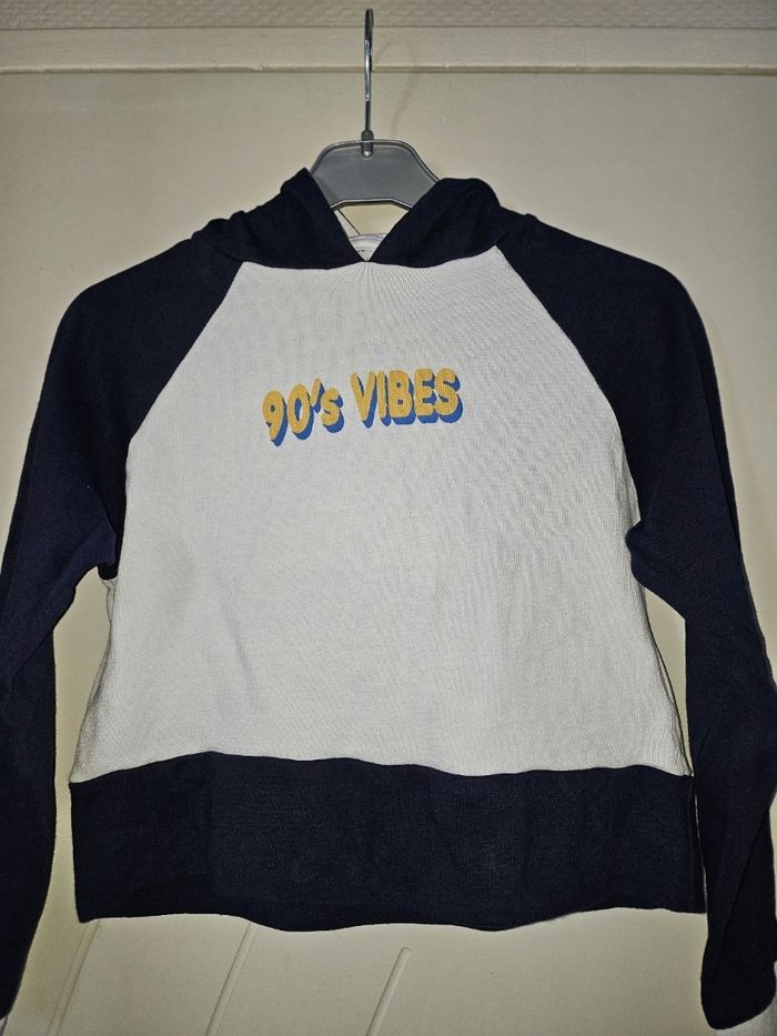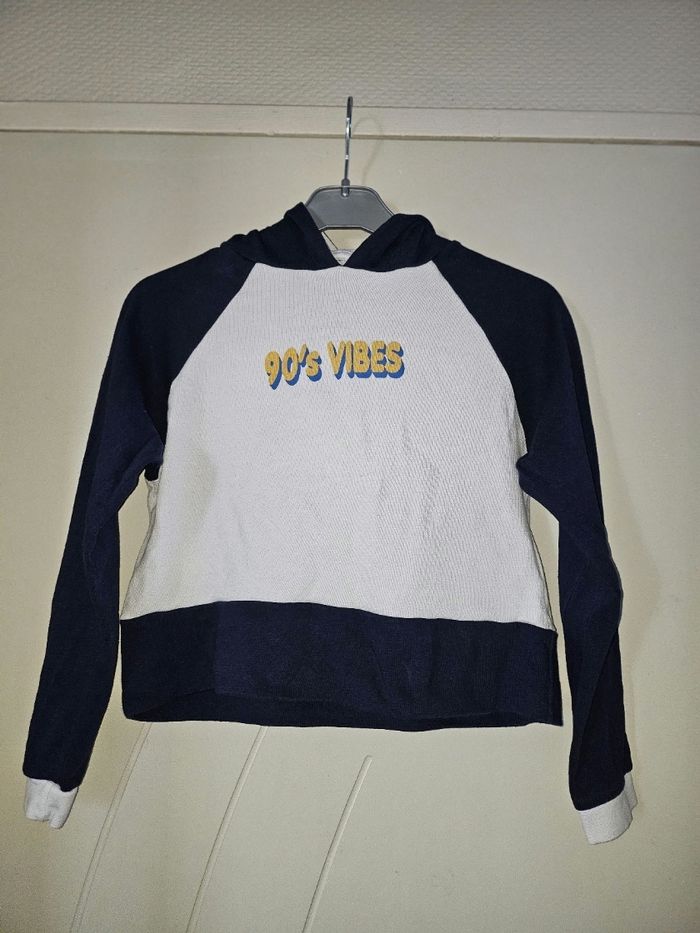 Sweat à capuche blanc et bleu marine, forme courte. En bon état