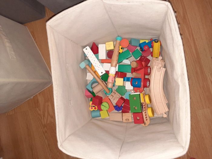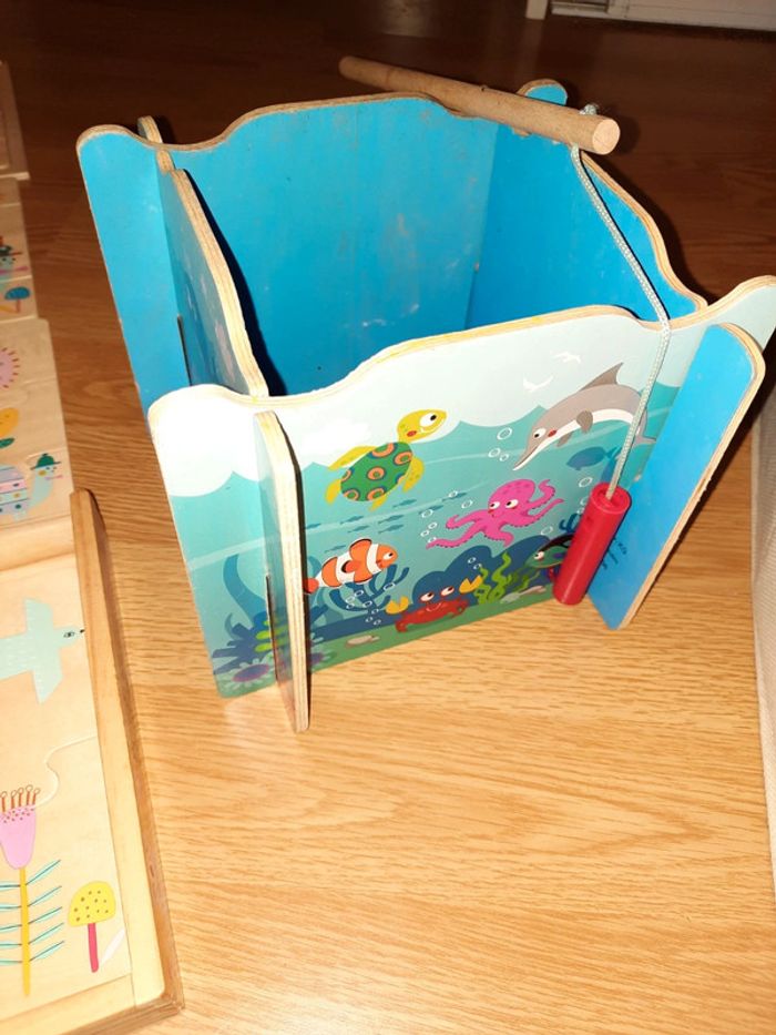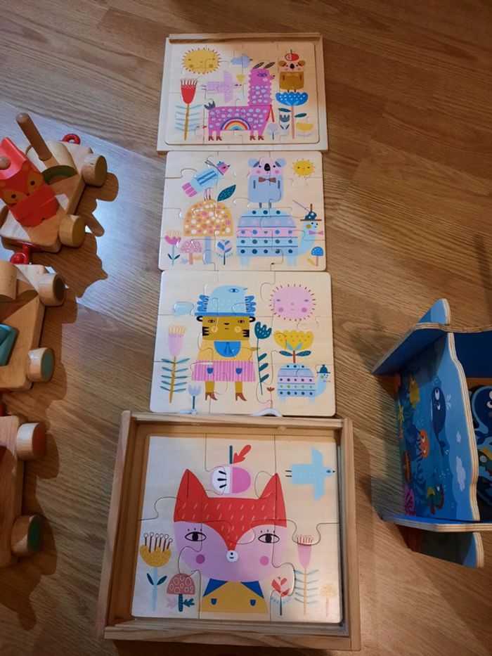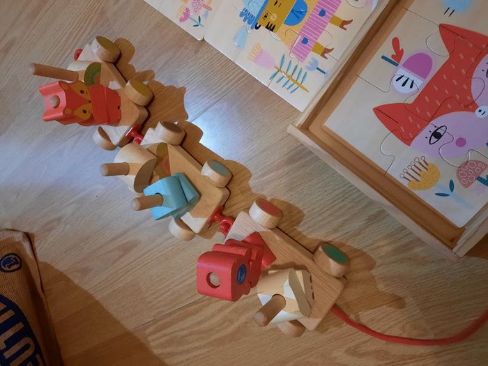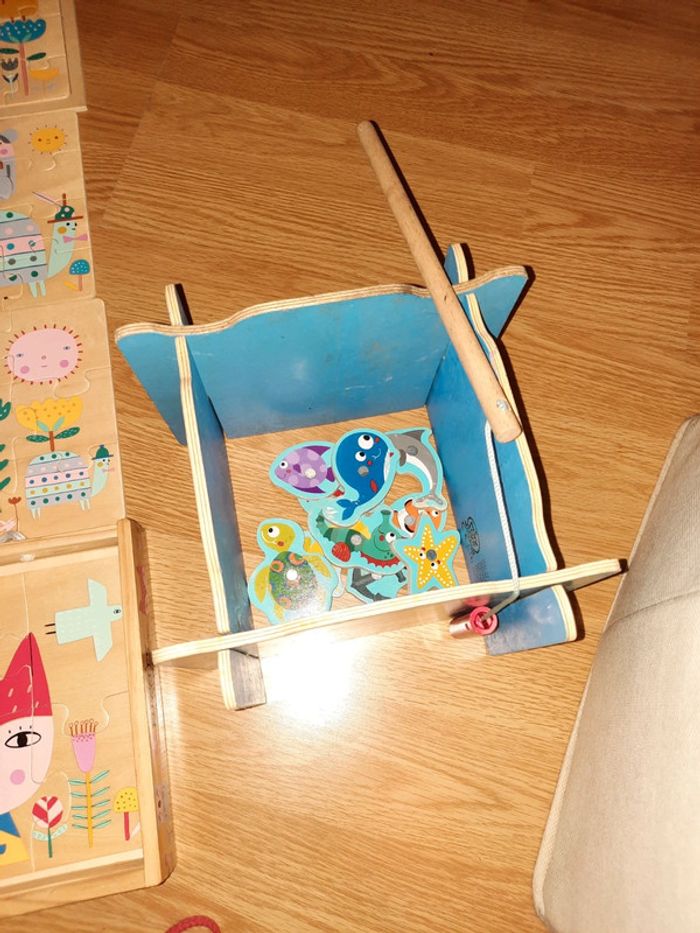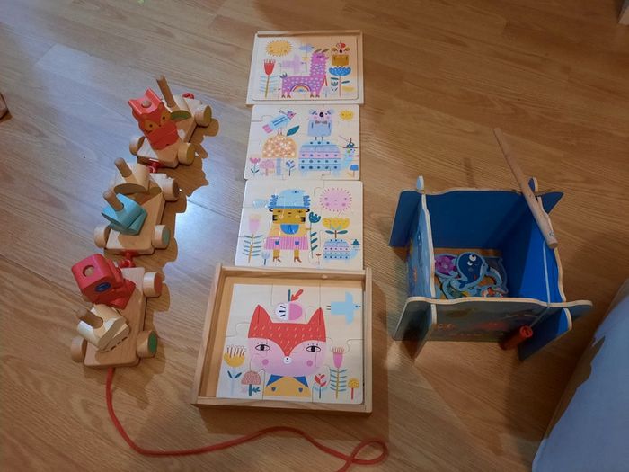 Lot de 3 jouets en bois : petit train, puzzles et pêche aux poissons. Tout en très état voir neuf pour les 4 puzzles et qq traces d'usure sur la pêche aux poissons.