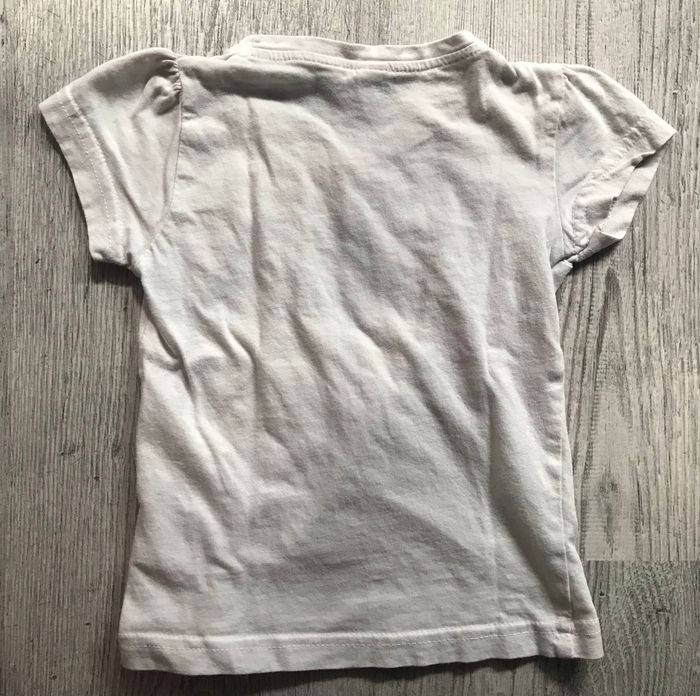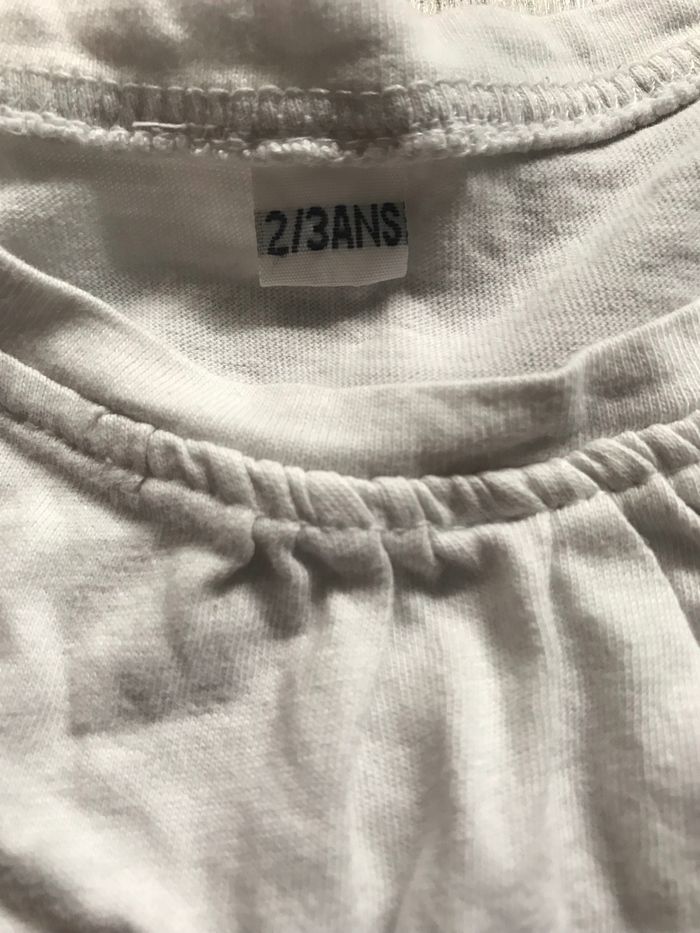 Tee shirt à manches courtes taille 2 ans (étiquette 2/3 ans mais taille en 2 ans) couleur blanc légères traces d’utilisation occasion, bon état