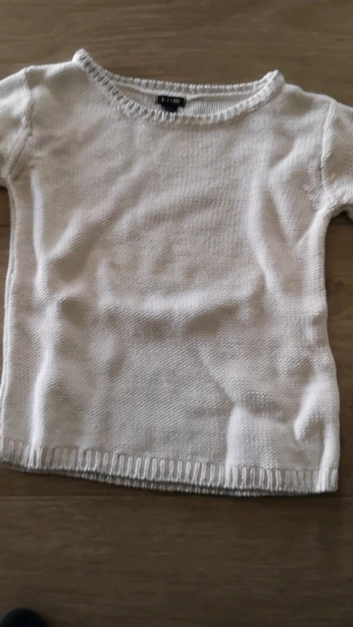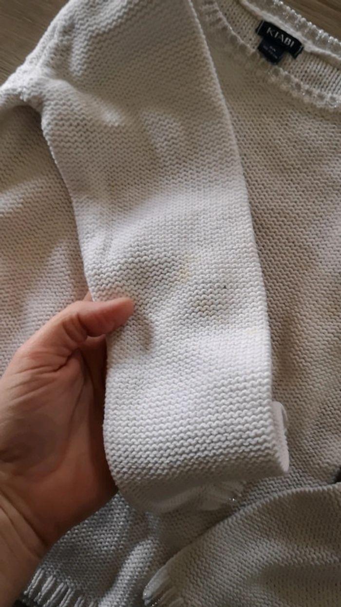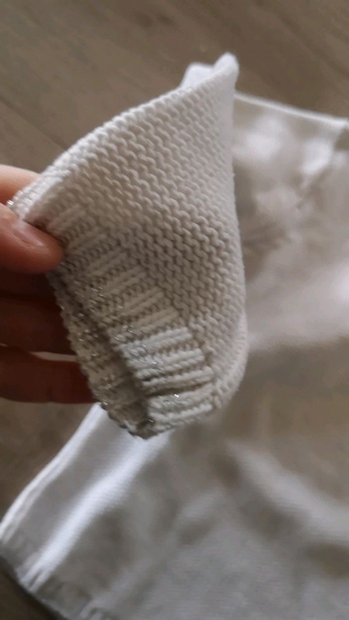 Blanc avec fils argentés aux extrémités en très bon état à noter tache discrète a l'arrière d'une manche #5ans #kiabi