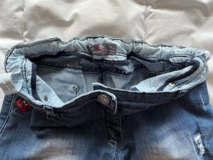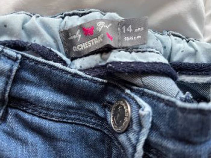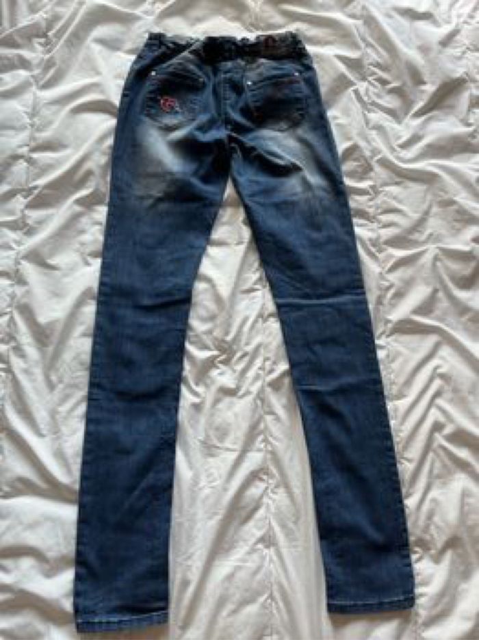 Jean fantaisie coupe slim. Composition 68% polyester, 30% coton et 2% élasthanne. Taille ajustable à l'intérieur par élastique et bouton. Fermeture par zip et bouton crochet. Poches italiennes devant et plaquées au dos. Aucun défaut.