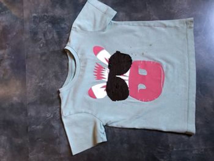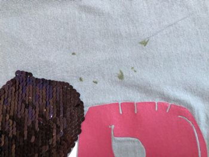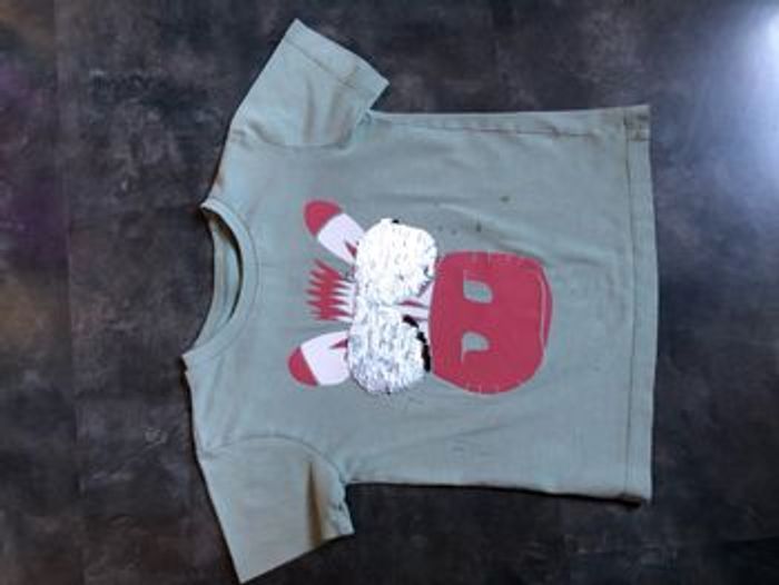 T-shirt manches courtes vert de gris , kaki clair Imprimé âne avec lunettes en sequins Des tâches sur chaque côté de la sérigraphie, voir sur les photos Taille 3 ans