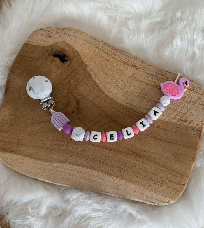 Attache-tétine personnalisé en silicone Matière première certifiée conforme à la norme EN71-3:2019 Ma création est conforme aux exigences de sécurité, c’est pourquoi l’article peut subir de légères modifications en fonction du nombre de lettres du prénom demandé ou si vous désirez un adaptateur MAM. Majoration de 1€ (Longueur maximale 22cm). Une photo vous sera transmise pour validation avant envoi de la commande. D’autres couleurs disponibles sur demande par message privé. Des précautions d’usages ainsi qu’un mode d’emploi vous seront remis.