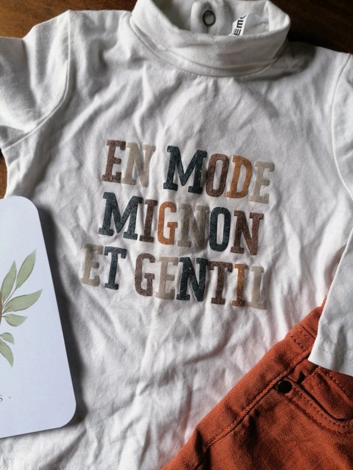 Lot Tee-shirts manches longues et jeans couleur brique. Jamais portés juste lavés. Taille 9 mois