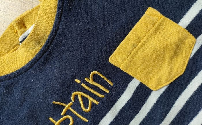 Tee-shirt manches longues marin, écriture Captain, marinière avec poche jaune. Très bon état. Réduction sur les lots