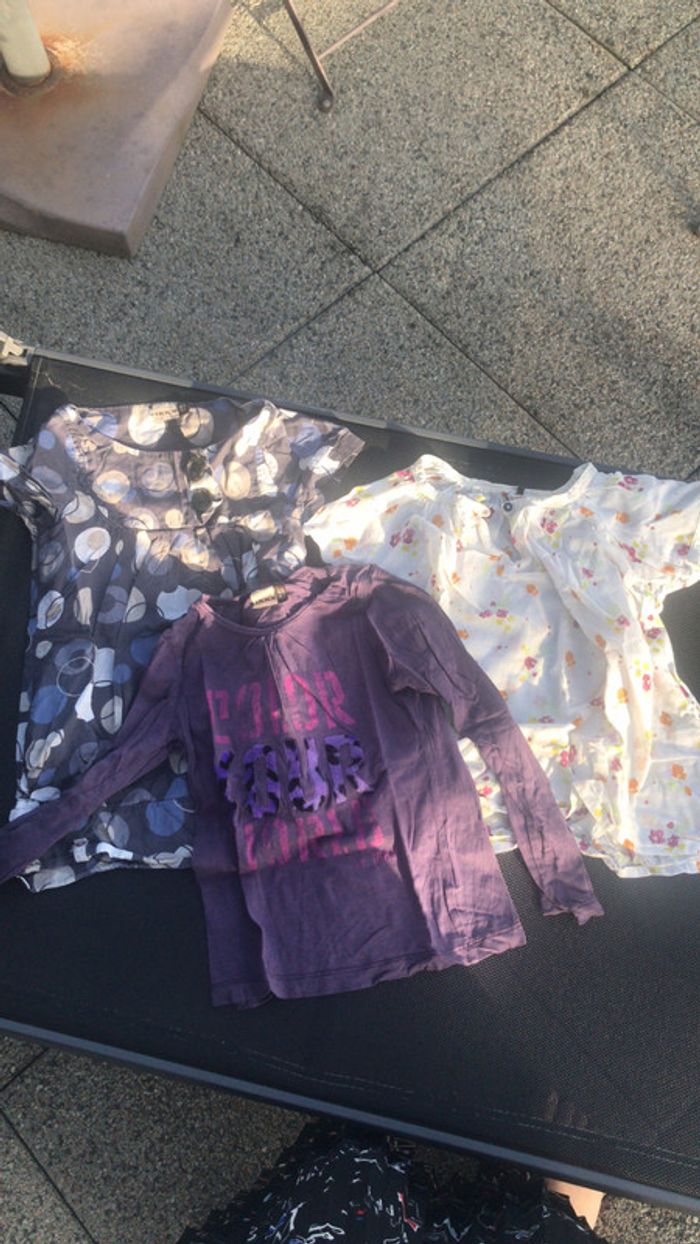 1 blouse bleue, 1 blanche à fleurs et un t-shirt mauve, imprimé. Bon état