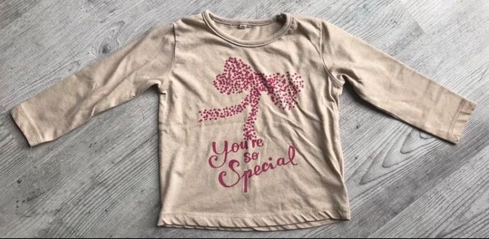 tee shirt à manches longues taille 2/3 ans couleurs beige et rose présence de petites bouloches occasion, bon état