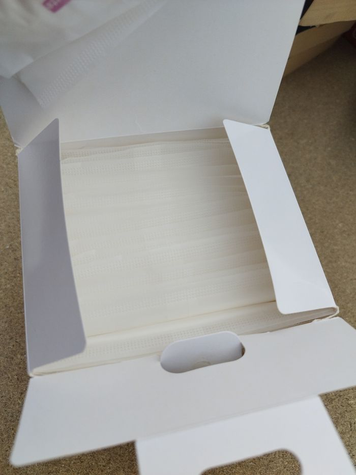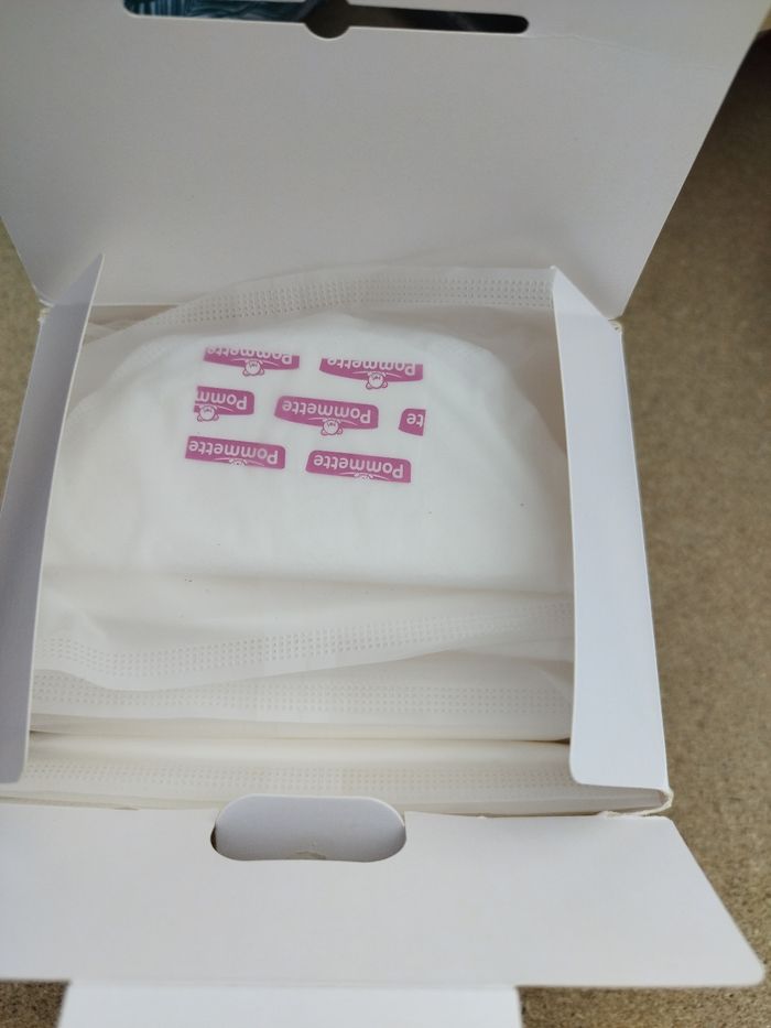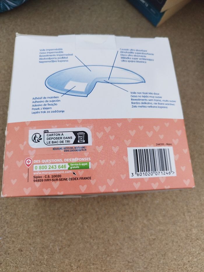 Boîte complète de coussinets d'allaitement ouverte seulement pour y glisser deux coussinets pommettes si non elle est complète.