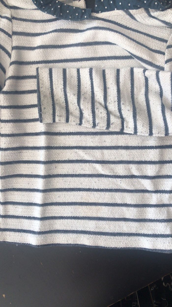 Lot de 3 pulls, un gris clair et un blanc rayé okaïdi, un gris foncé tape à l’œil. Quelques bouloches (surtout sur le blanc), et légère tâche sur le blanc (cf photo).