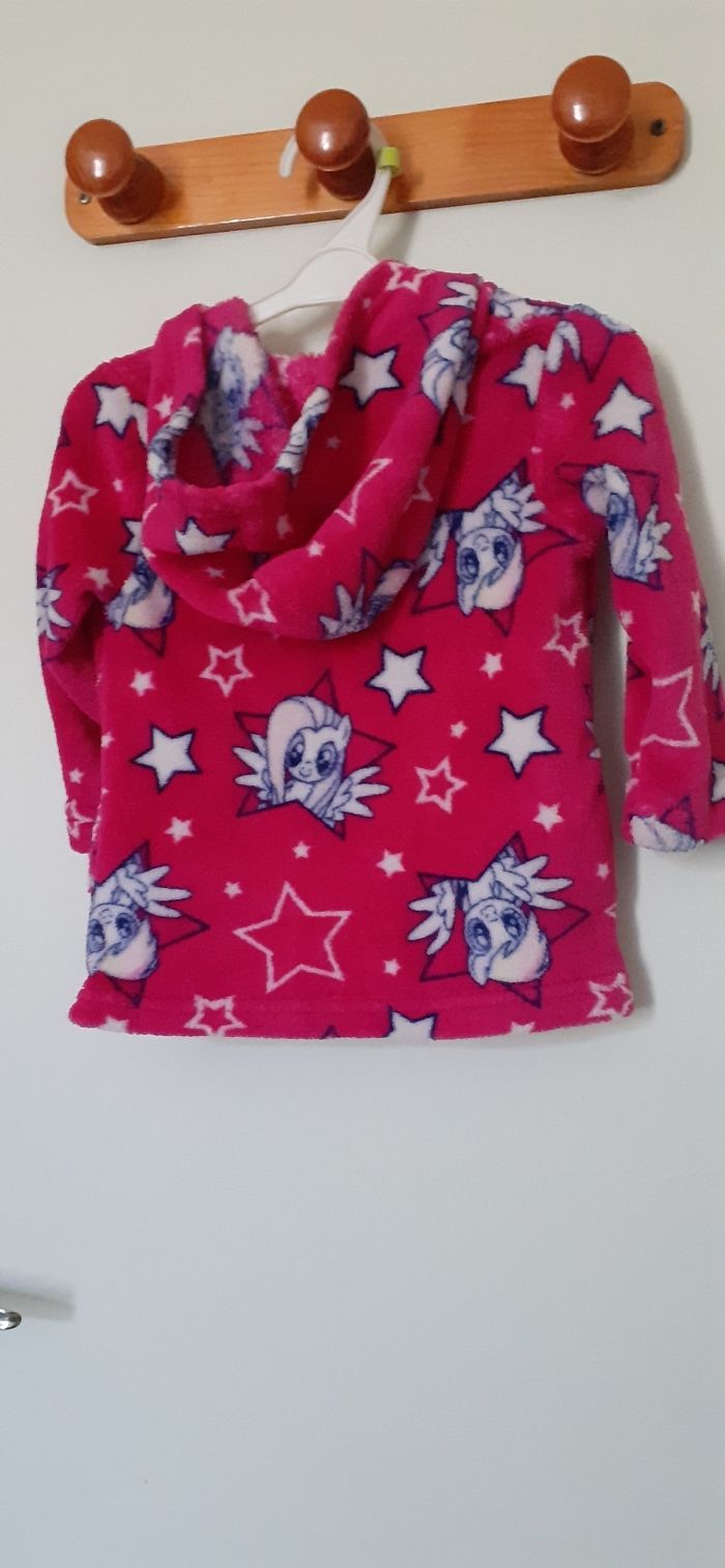 Vends une veste zippee genre polaire à capuche 100% polyester rose foncé avec motifs blancs et noirs; Marque My little Pony, taille 3 ans.