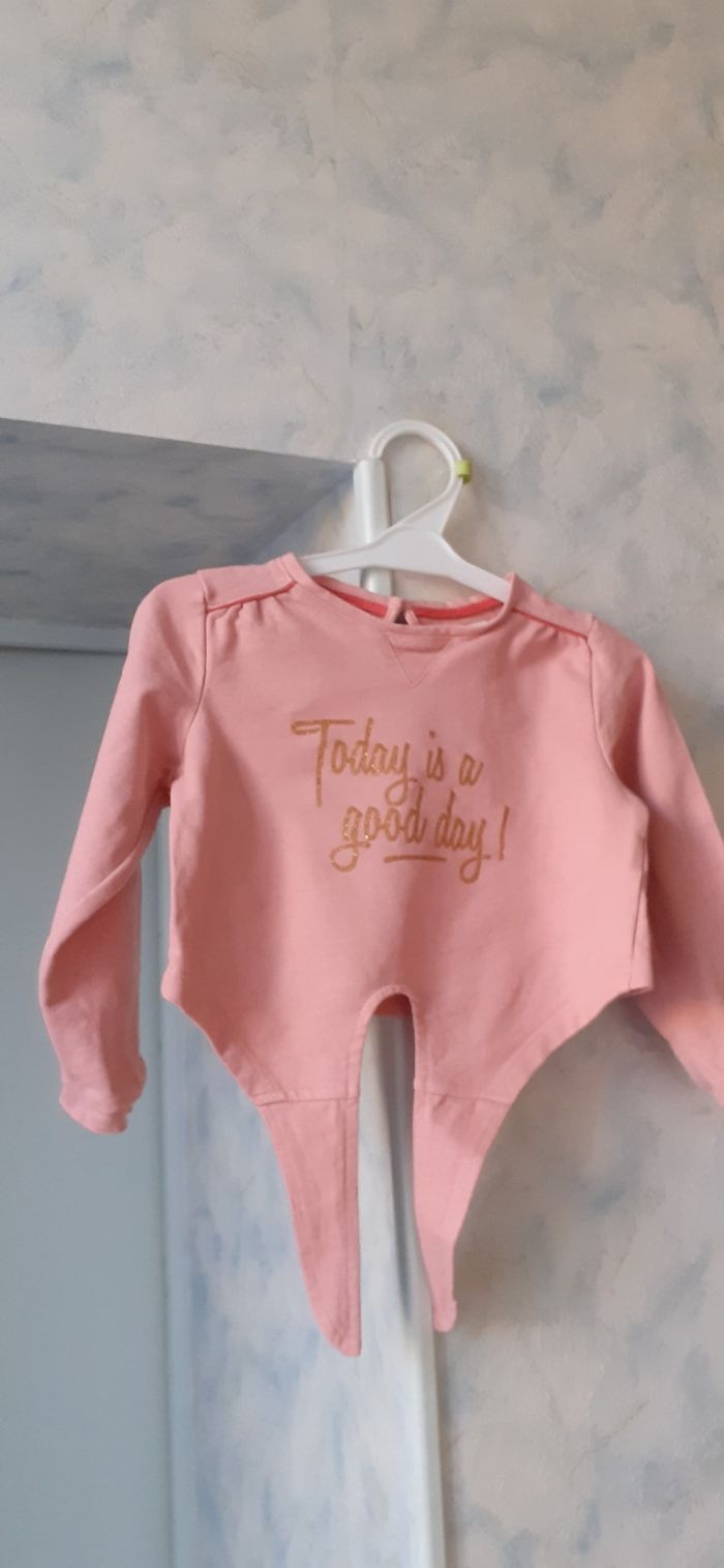 Vends un swear en coton et polyester rose corail avec écritures dorées marque Vert baudet taille 4 ans sur l étiquette mais taille petit.