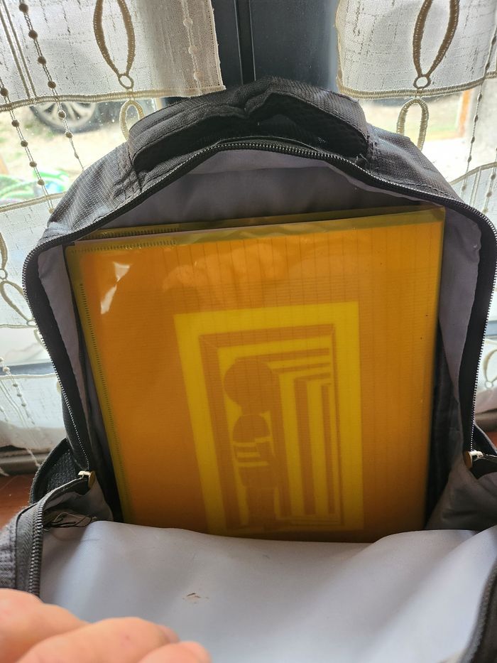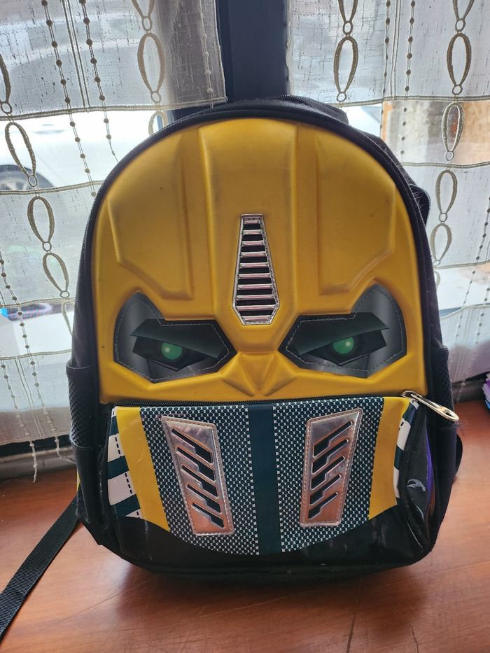 Sac a dos transformer bumblebeeles yeux s'allume bonne état à l'intérieur 1 cahier 21/29,7 +pochette carton passé largement voir photos mon fils la utiliser en cp