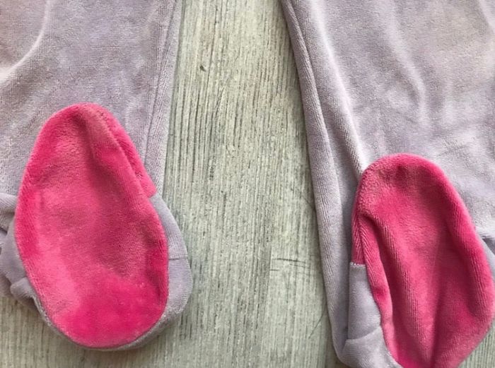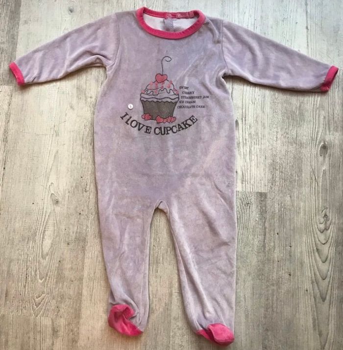 pyjama grenouillère une pièce de la marque Miss Cutie taille 23 mois couleurs mauve et rose motif cupcake traces d’usure sous les pieds (voir photo) occasion, bon état